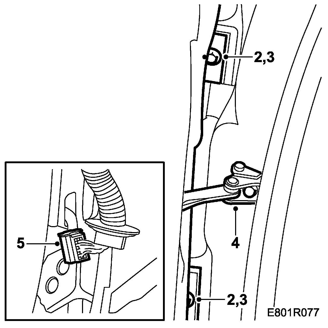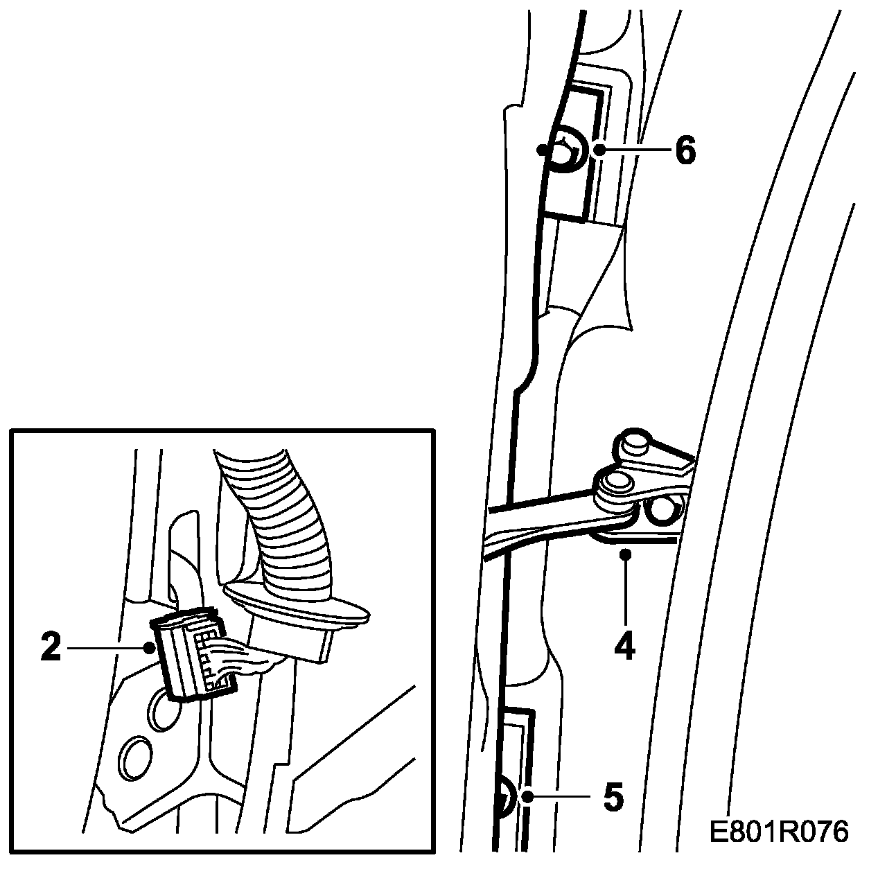 1. Open the front door so that the grommet for the rear door wiring harness in the B-pillar is accessible.
