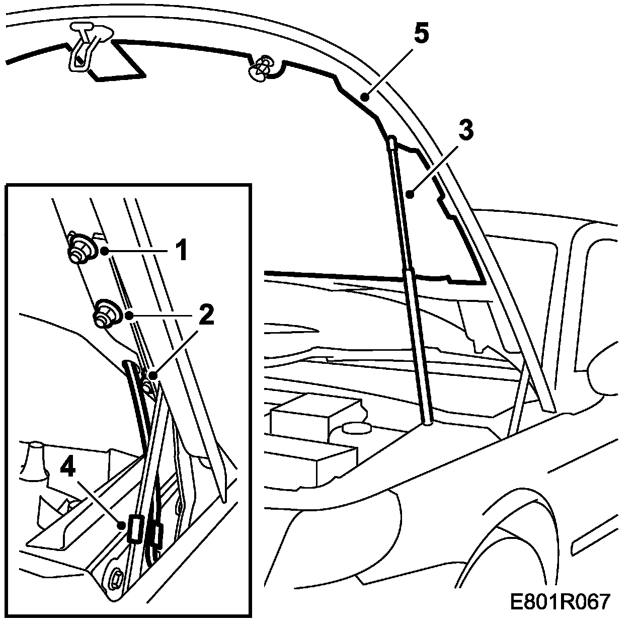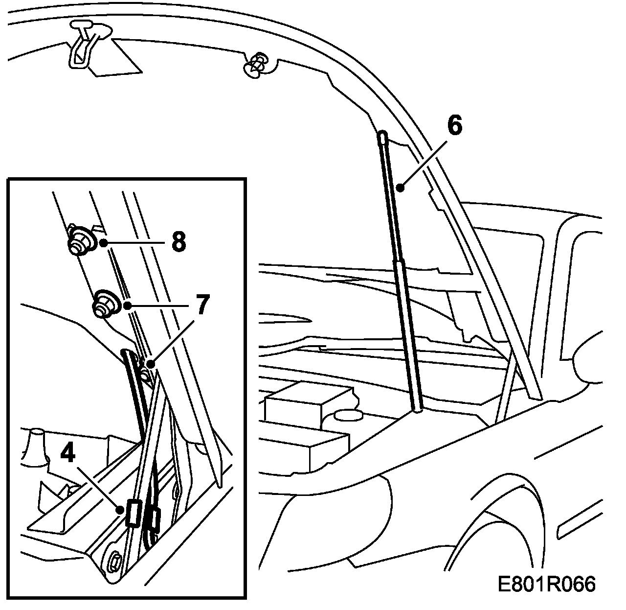 6. Remove the upper mounting of the gas spring, fitted to a ballpin in the bonnet and locked with a clip (2 people).