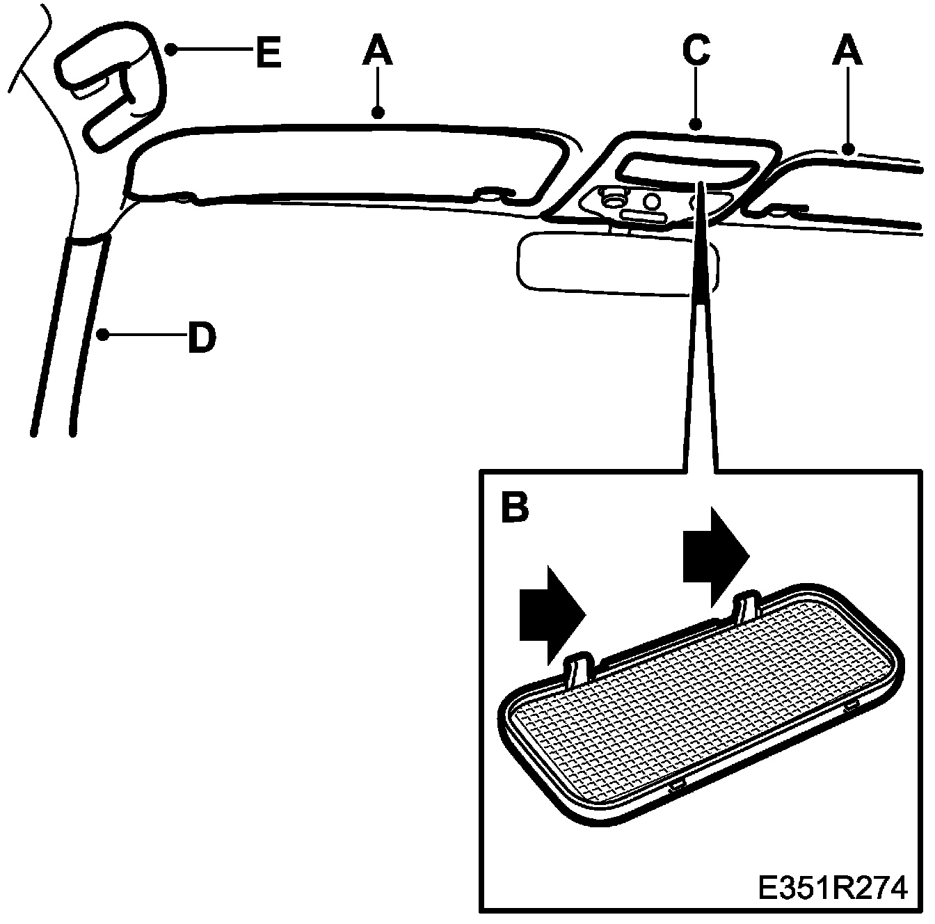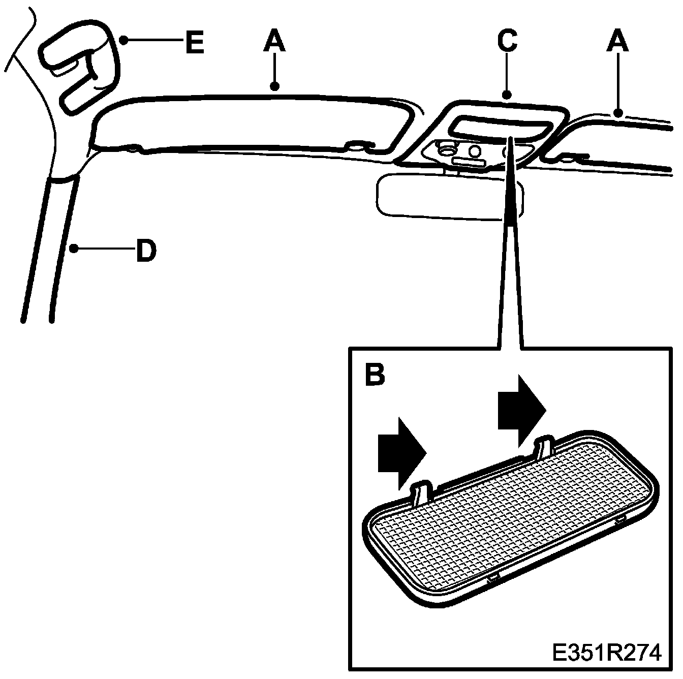 WARNING: Take care not to damage or loosen the energy absorbers. Damaged or loose energy absorbers must not be refitted. If the occasion should arise, the entire headlining must be changed. Damaged energy absorbers may impair head protection in case of a collision.