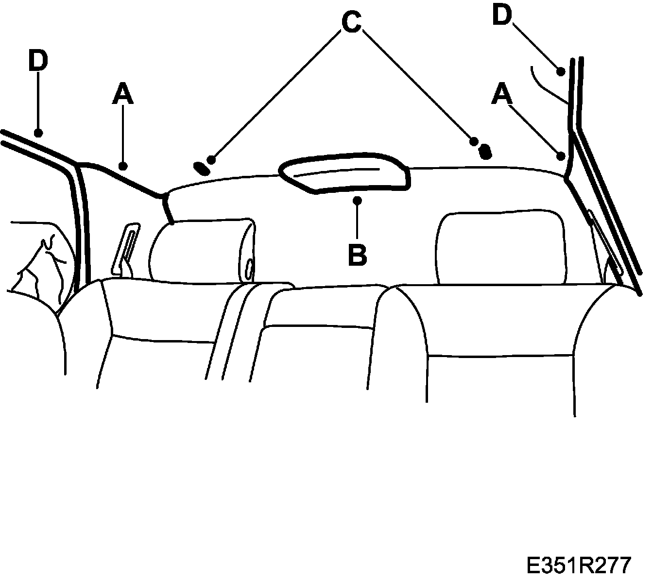 15. Carefully release the headlining from the door weatherstrips (D). First undo the passenger side and then the driver's side.