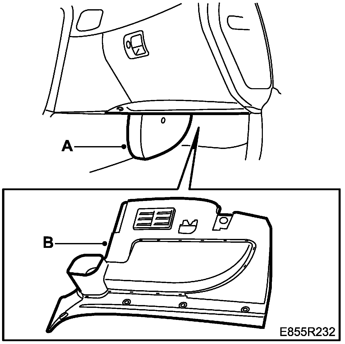 2. Remove the lower part of the panel under the glove box, 4 screws (B). There are clips in the front edge.