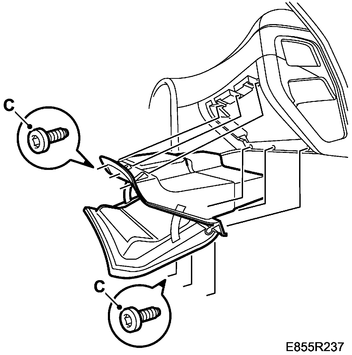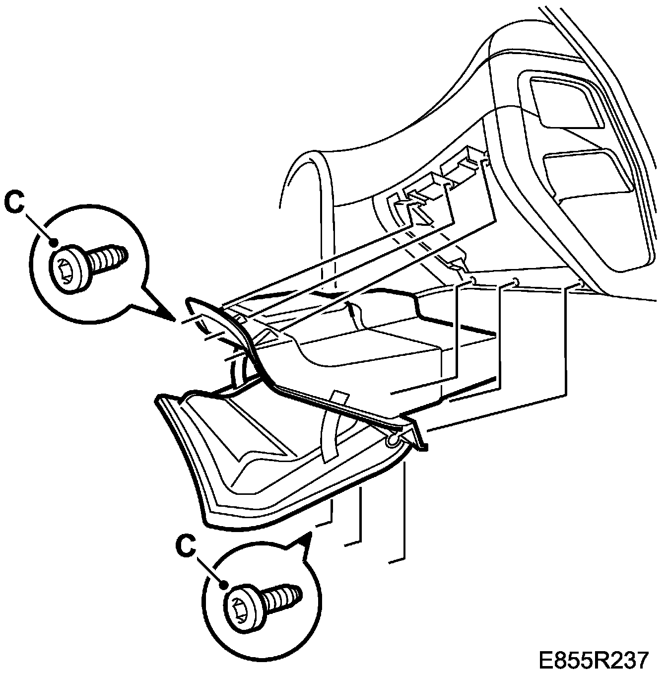 4. Undo 3 retaining screws under, and 3 retaining screws inside, the glove box (C).