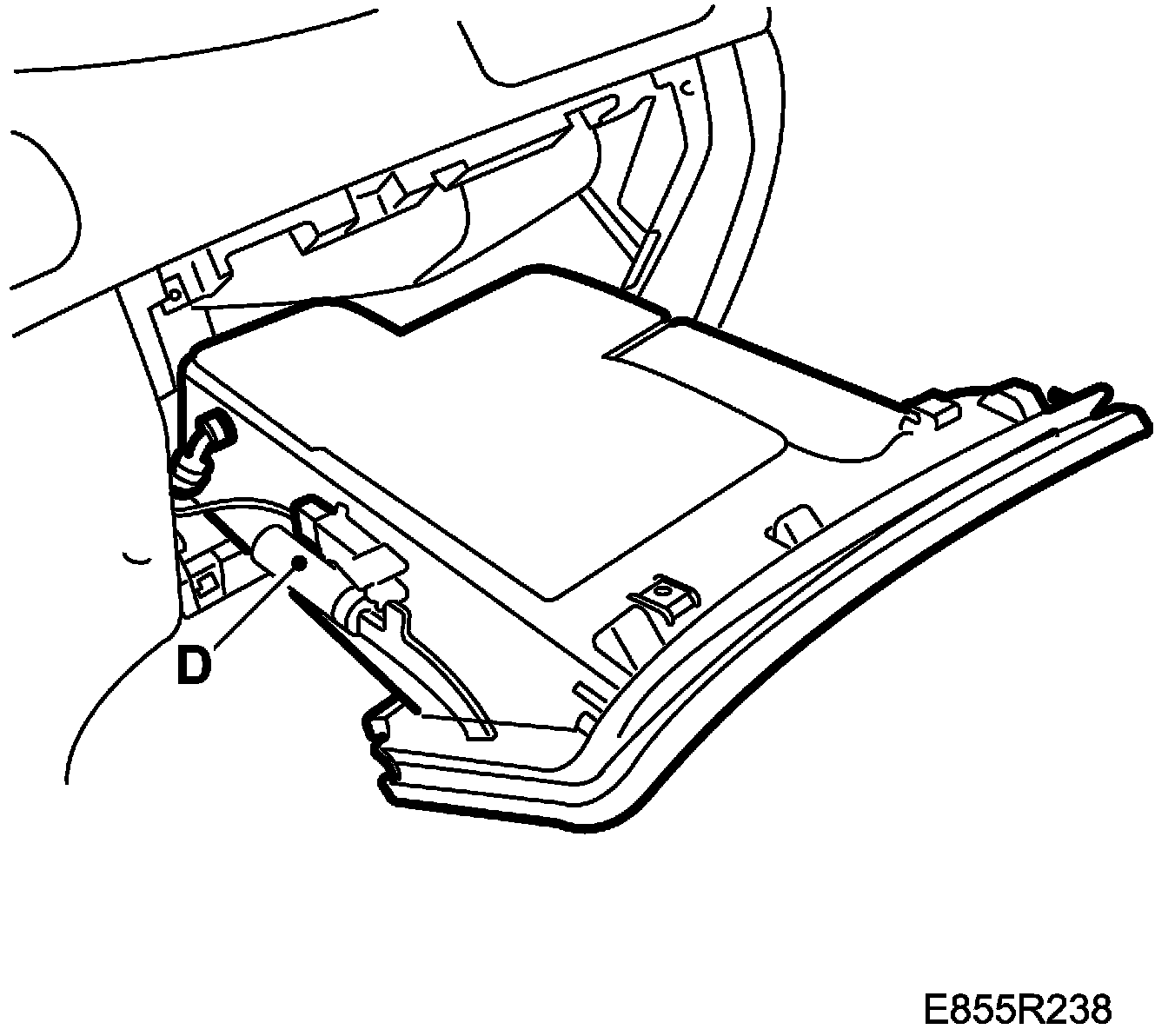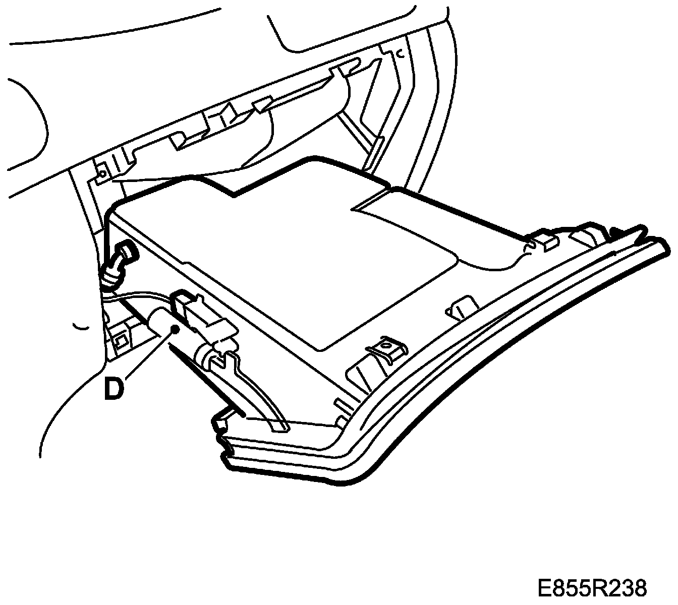 5. Lift out the glove box slightly and unplug the connector for the glove box lighting (D).