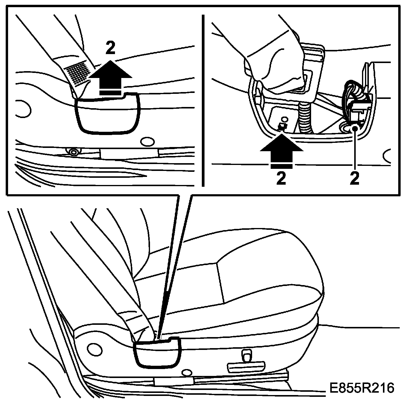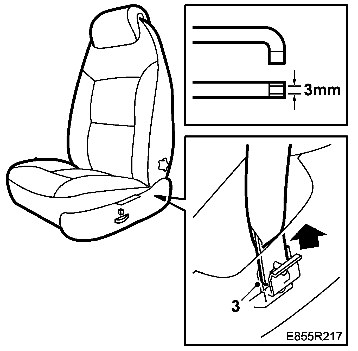 Check that the anchorage is correctly fitted by slackening the belt and pulling directly upwards with a force of 5 N. Check that the catch is visible on the outside of the mounting.