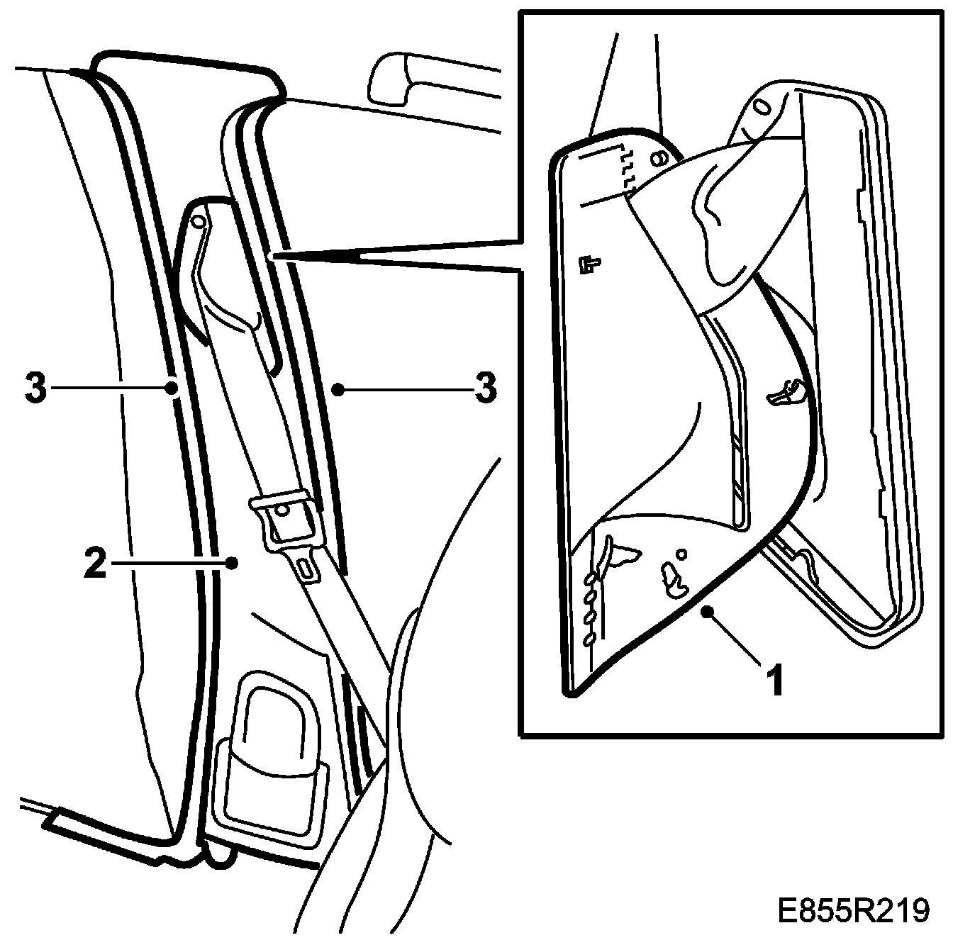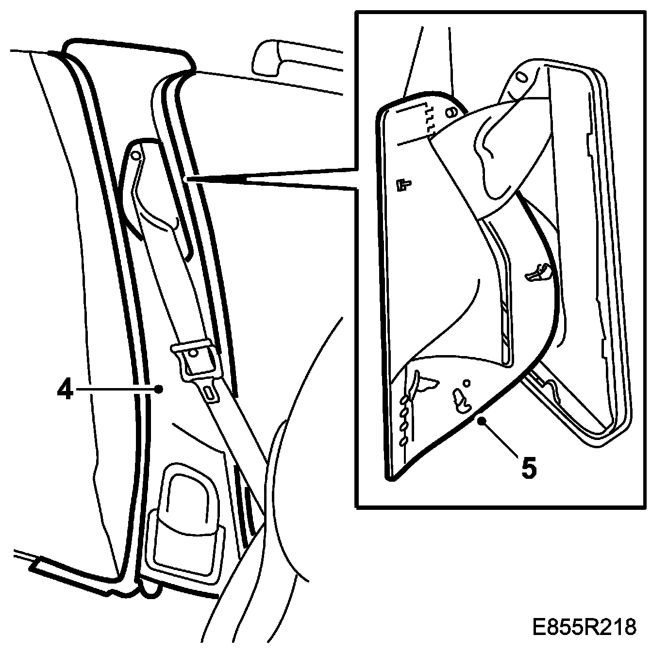2. Fit the B-pillar trim. Check that the carpet and sill scuff plate are covered by the B-pillar trim.