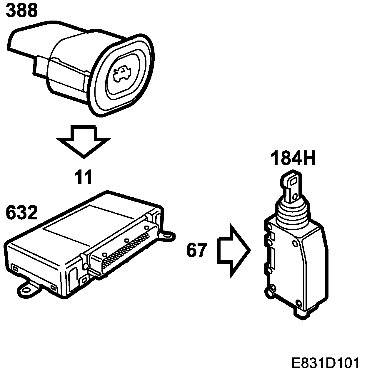 When switch 388 on the driver's door is activated, pin 11 on the TWICE control module will be grounded and TWICE will in turn output a short voltage pulse on pin 67 to the tailgate lock motor, which unlocks the tailgate.