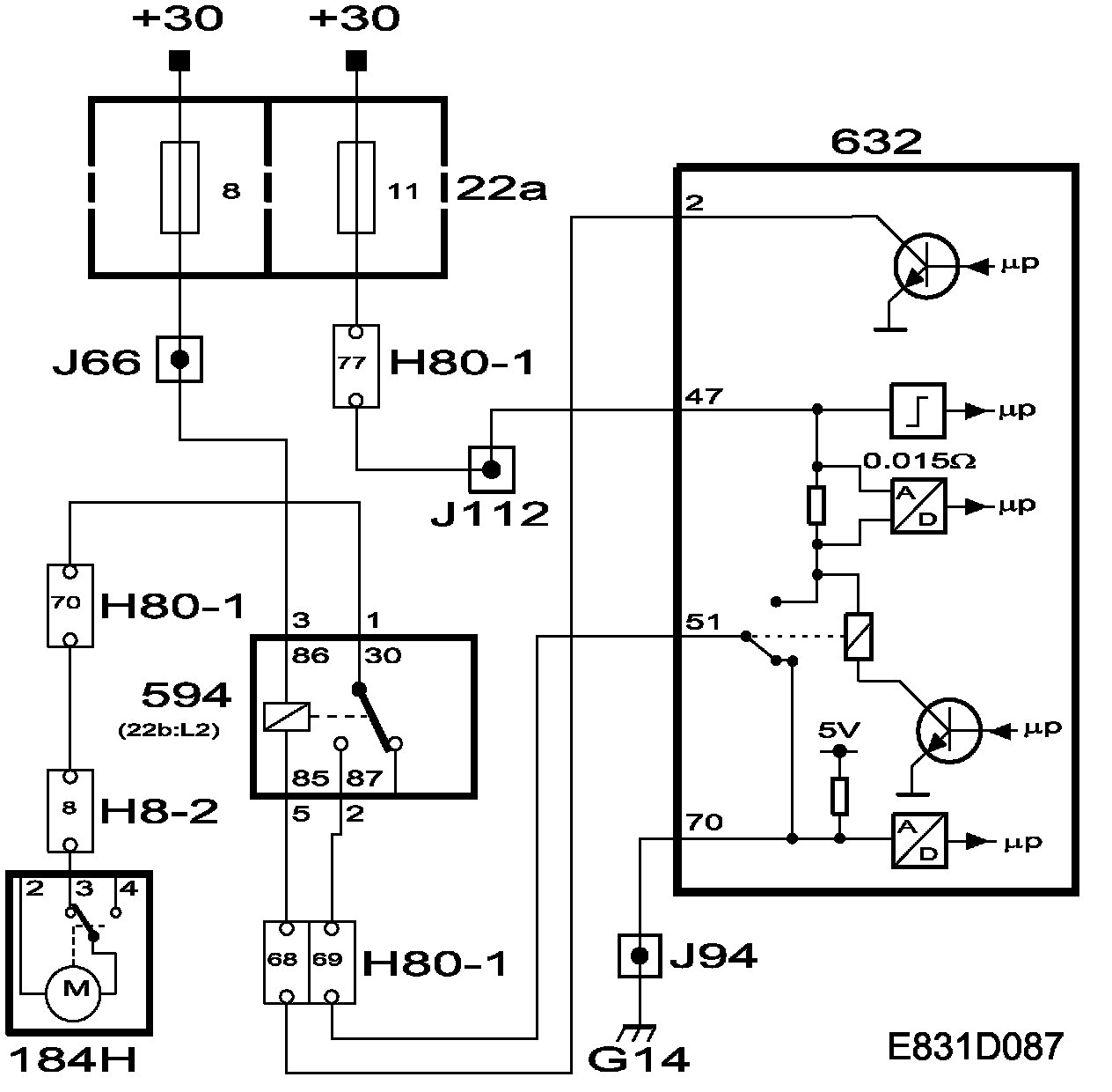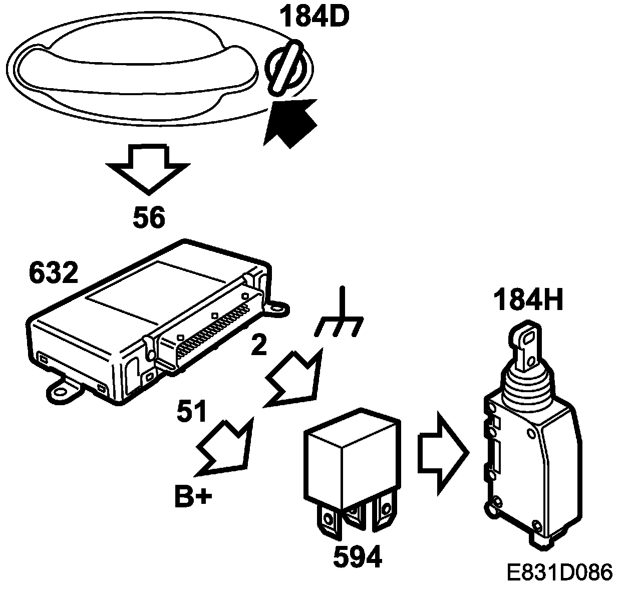 A short voltage pulse (0.8 sec.) is fed to the tailgate lock motor from TWICE control module pin 51 via relay 594, which activates when the coil is grounded by TWICE control module pin 2. The tailgate lock motor will then lock the tailgate.