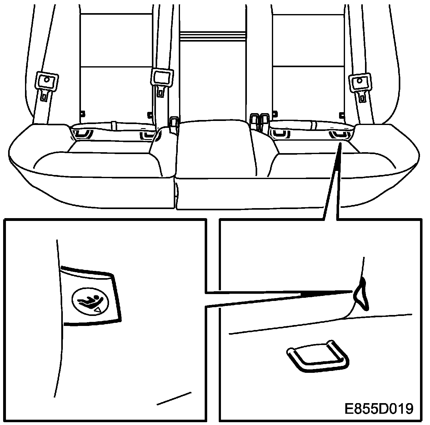 Anchorage points for installing child seats are provided between the backrest and seat squab in the rear seat. These anchorage points consist of two lugs for each child seat located at the two outer seats. Above each lug is a label sewn to the backrest upholstery. The hooks are designed for child seats built in conformity with ISOFIX standards.