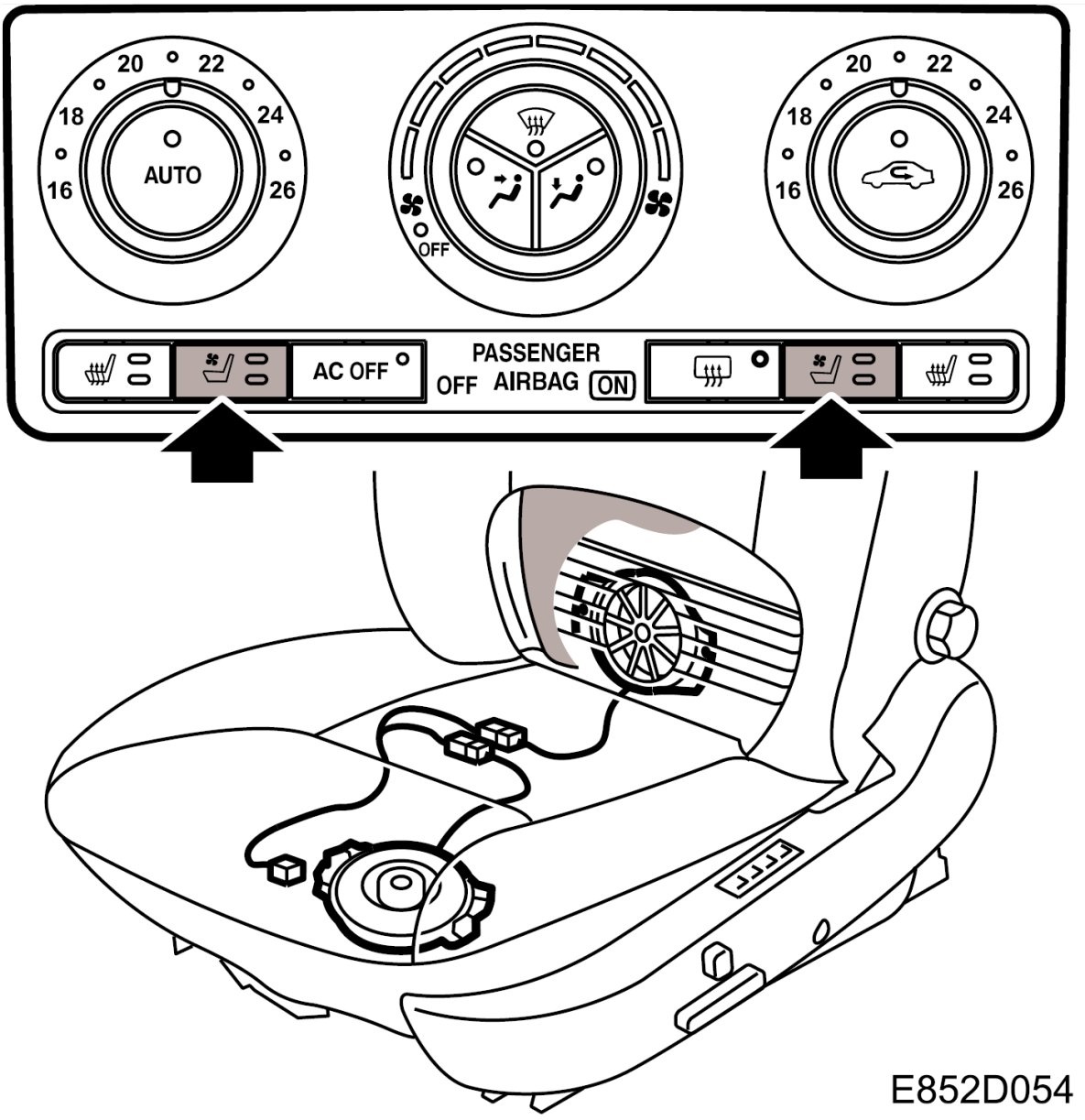 The fans in the ventilated seats are controlled manually with pushbuttons in the ACC panel. The LEDs in the buttons show fan speed. The preconditions are that the engine is running and that the cabin fan knob is not in the OFF position.