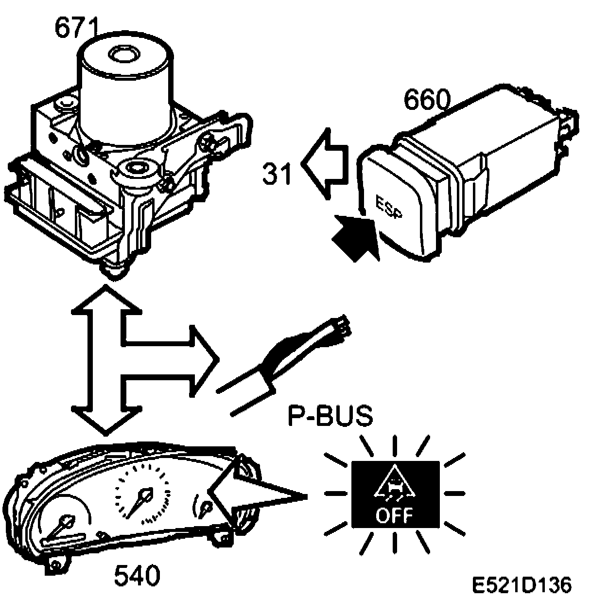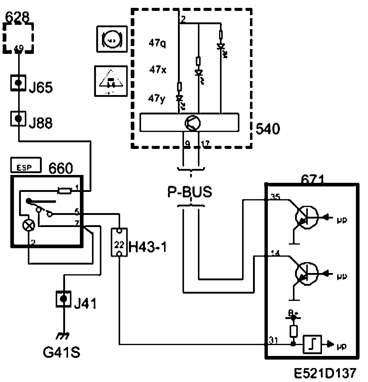 The switch is connected to pin 31 of the ESP control module and grounding point G41S. The ESP control module supplies B+ on pin 31. When the button is pressed, the circuit is closed to ground and the ESP function is engaged or disengaged depending on its previous mode.