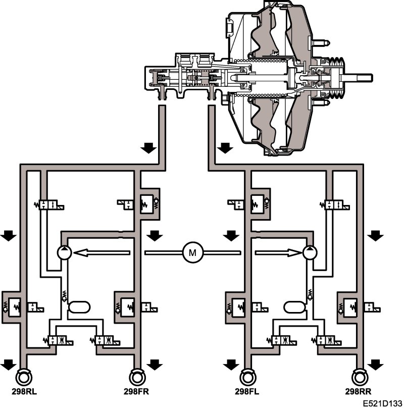 Braking without ABS modulationWhen the brake pedal is depressed, the vacuum passage is closed while the air passage is constantly open. The greatest possible pressure difference effects the diaphragm, resulting in maximum braking pressure.