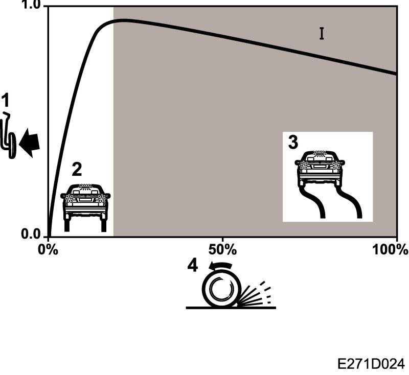 Starting from 0%, the braking force increases rapidly while wheel slip increases slowly until a maximum value is reached. Beyond this value, braking force decreases as wheel slip increases.