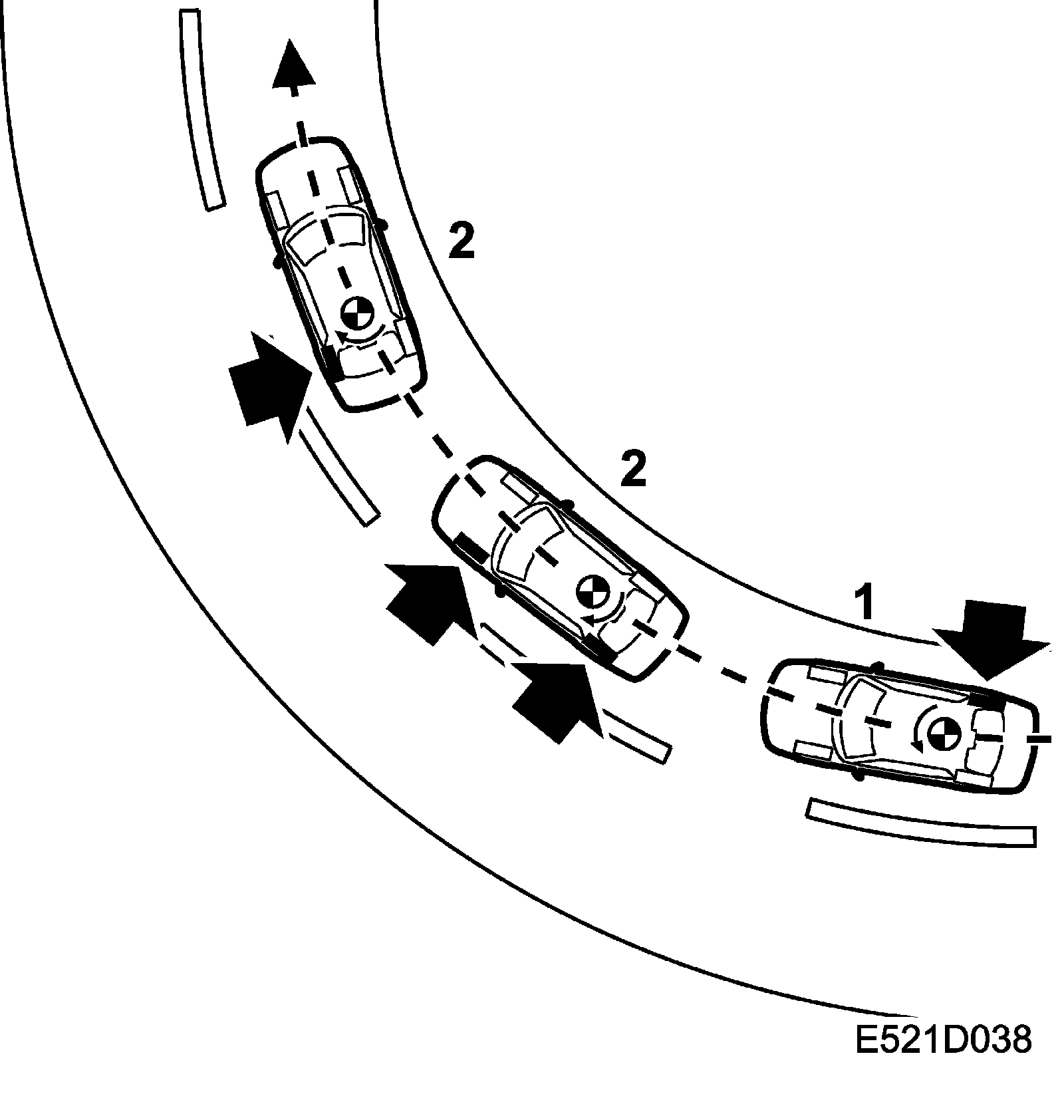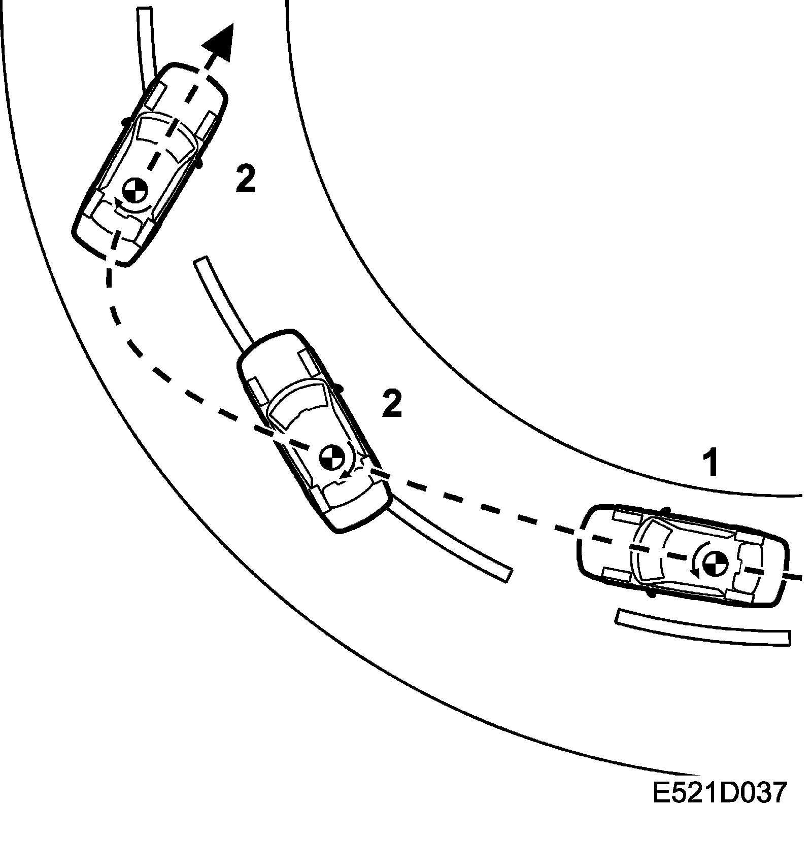 If the car starts to understeer (1) the yaw rate sensor measures a lower value than that calculated. The system applies the brakes on the inside rear wheel until the measured and calculated yaw rates agree.
