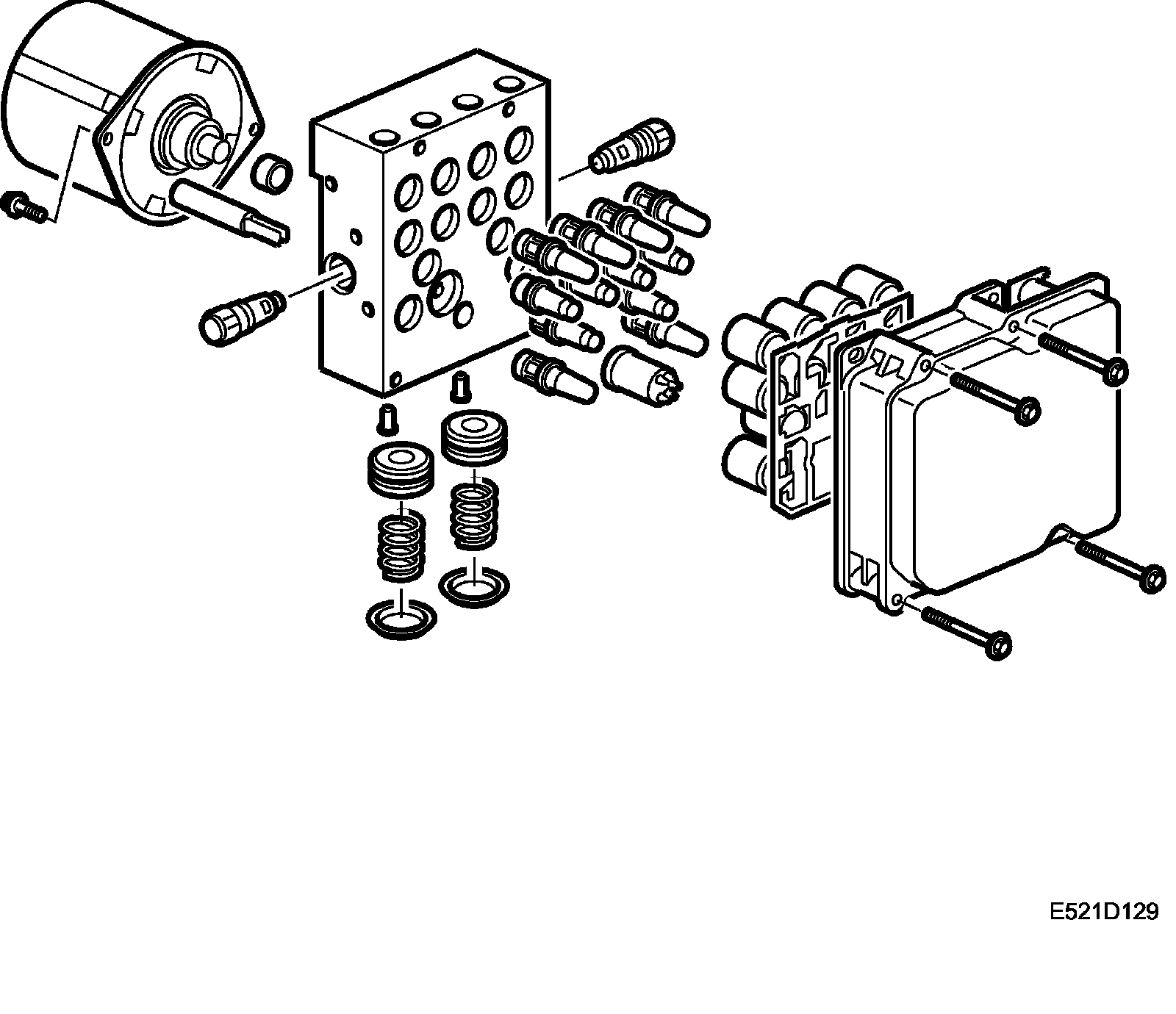 Valve block, functionThe valve block/hydraulic unit comprises 12 solenoid valve: four inlet valves, four outlet valves, two pressure increase valves and two pressure relief valves. These valves are used to control the brake pressure for ABS, TCS and ESP modulation.
