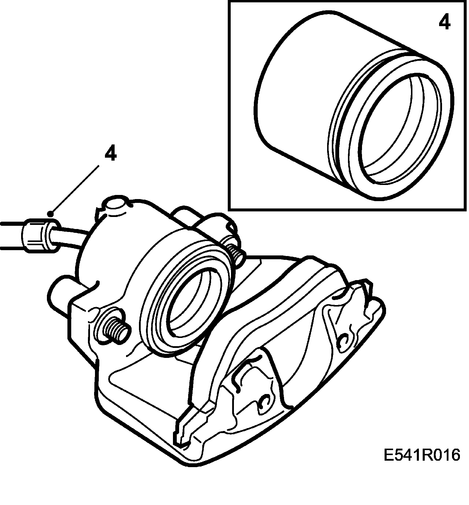 4. Press out the brake piston by blowing compressed air through the hose connection. Use a brake pad as a stop.
