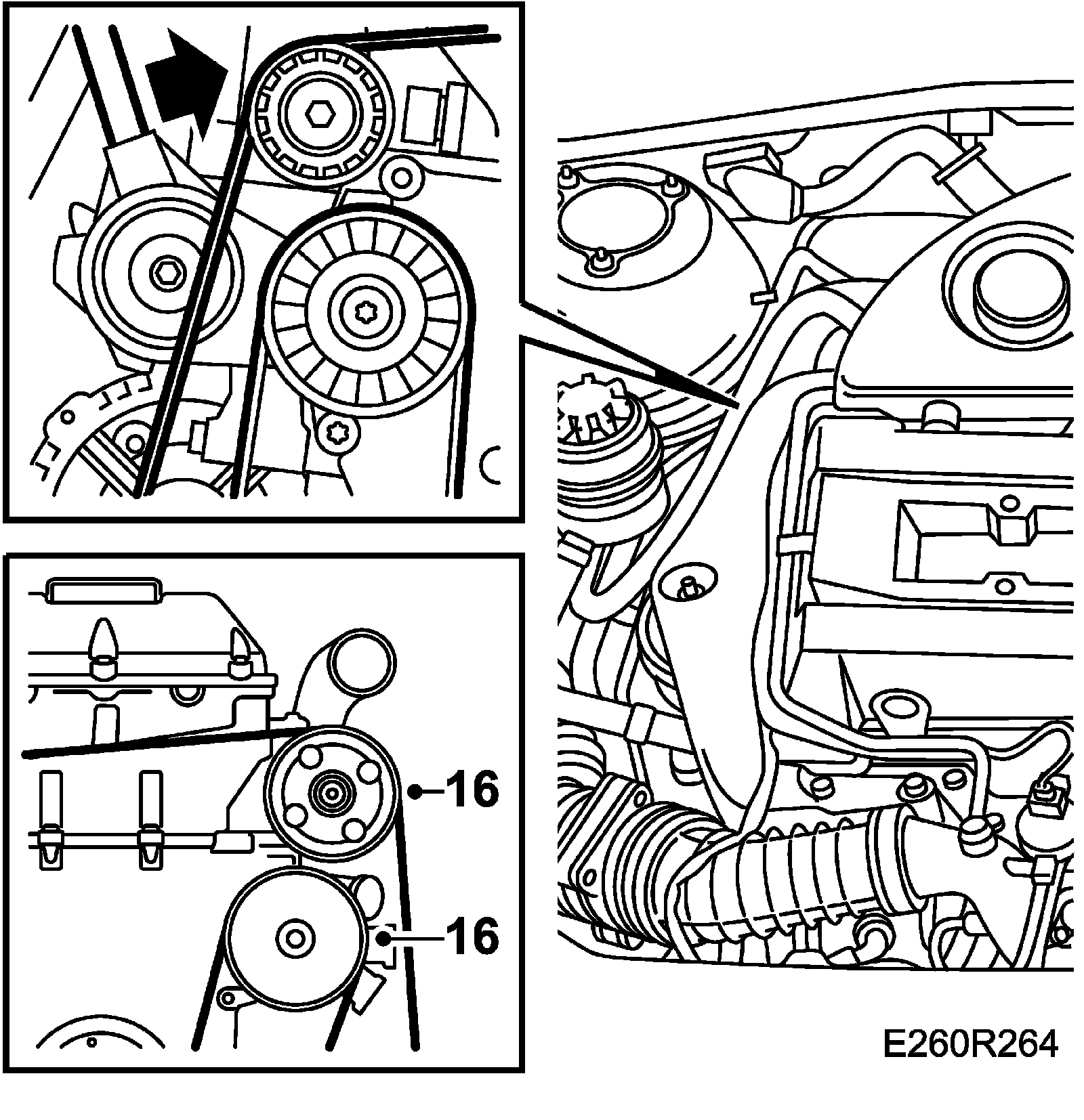 16. Fit the poly-V-belt and adjust the belt tensioner. Use a 83 95 254 Drawbar handle, hydraulic belt tensioner.