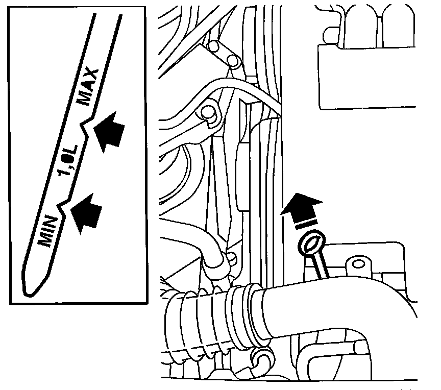 Top up with oil to the MAXIMUM mark on the dipstick. The distance between the MAXIMUM and MIN marks corresponds to 1 litre (1.05 quarts).