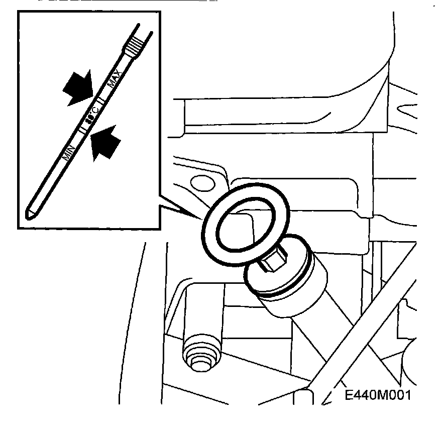 Important: The dipstick has two sets of level marks, one set for hot oil and one for cold oil. The amount of fluid between the maximum and minimum marks is about 0.4 litres (0.4 quarts).