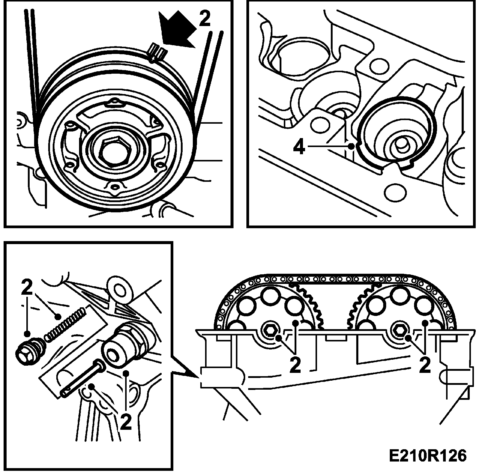 12. Check that the chain runs correctly on the chain guides. Rotate the crankshaft two turns and check the settings of the flywheel and camshafts. Tighten the camshaft sprocket bolts.
