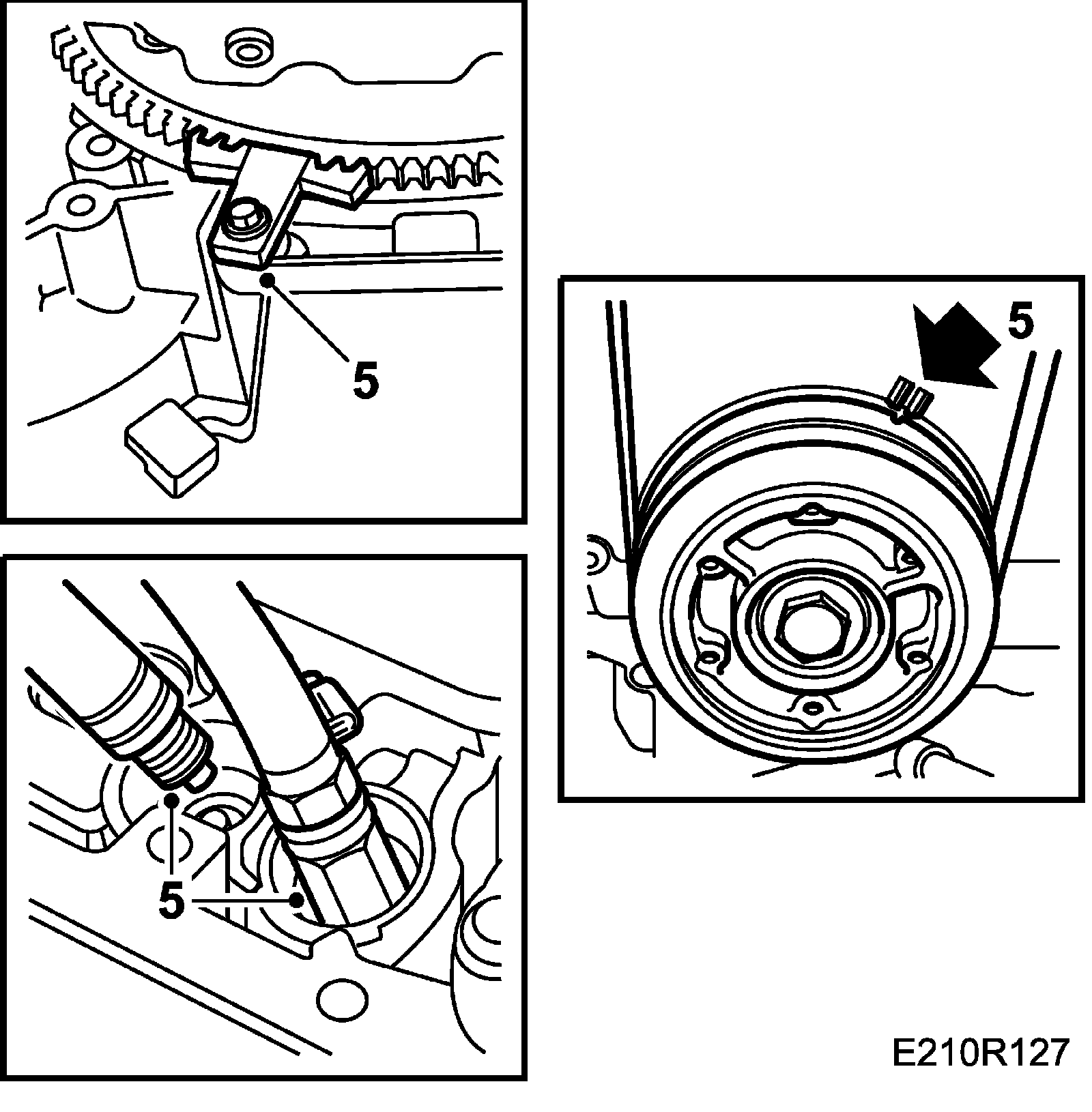 5. Rotate the crankshaft until the piston in the cylinder concerned is at top dead center. Lock the engine using 83 94 868 Flywheel locking segment and fit 83 94 173 Air nipple. Connect the compressed air and pressurize the piston and valves.