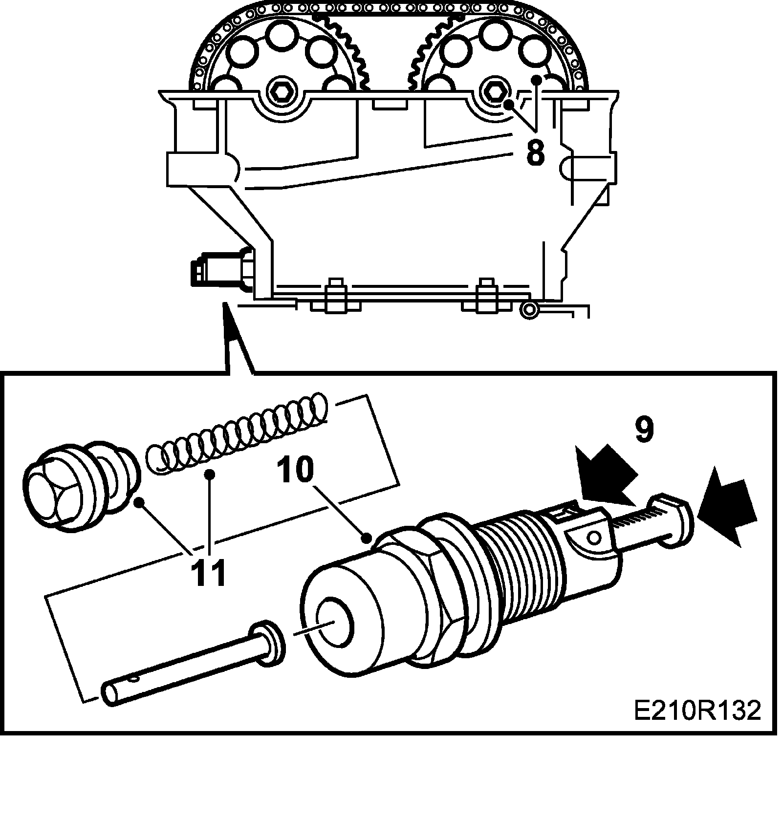 9. Prepare the chain tensioner for mounting by pressing down the catch and pressing in the chain tensioner.