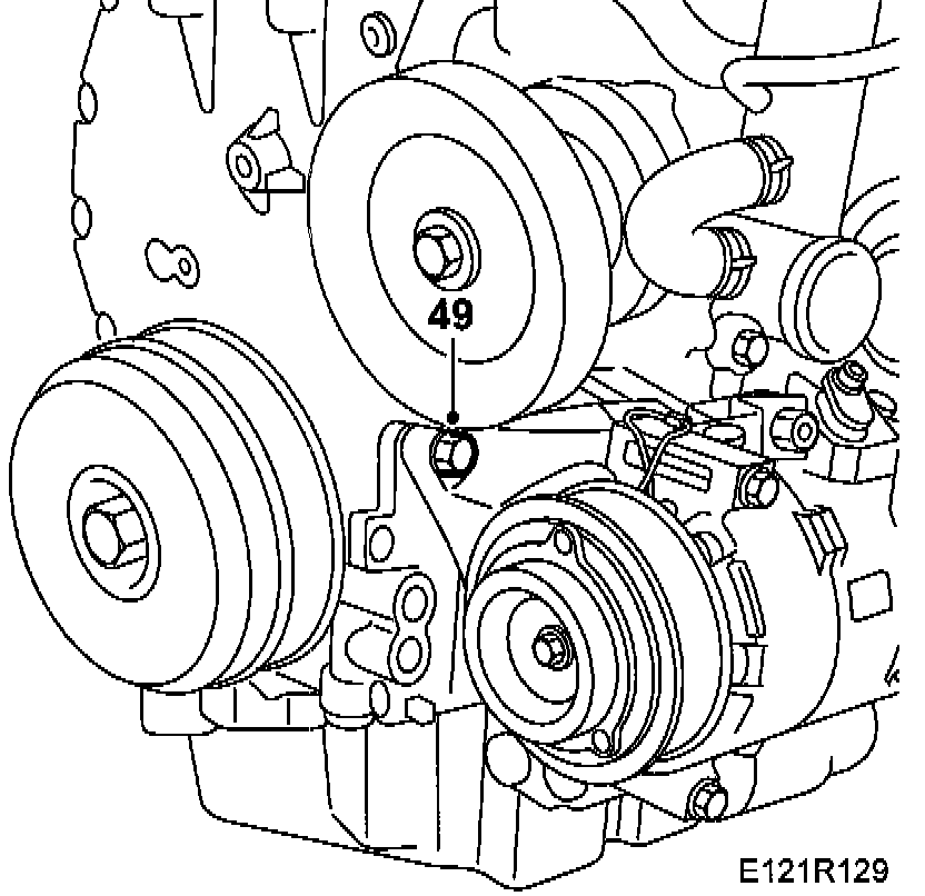 49. Remove the AC bracket right-hand upper bolt which screws into the timing cover.