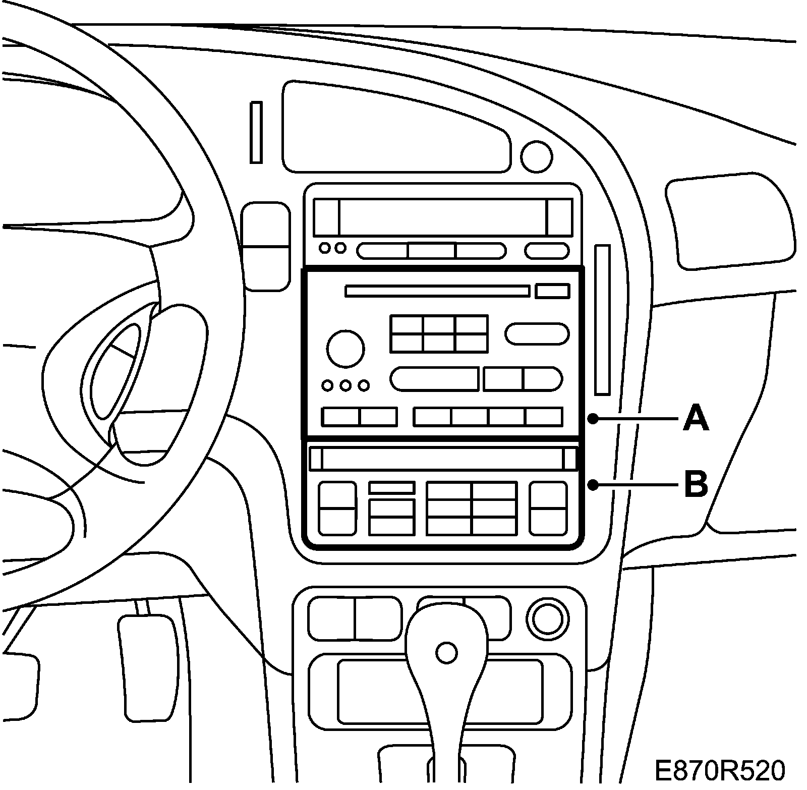 4. Remove the radio section (A) and the ACC control panel (B).