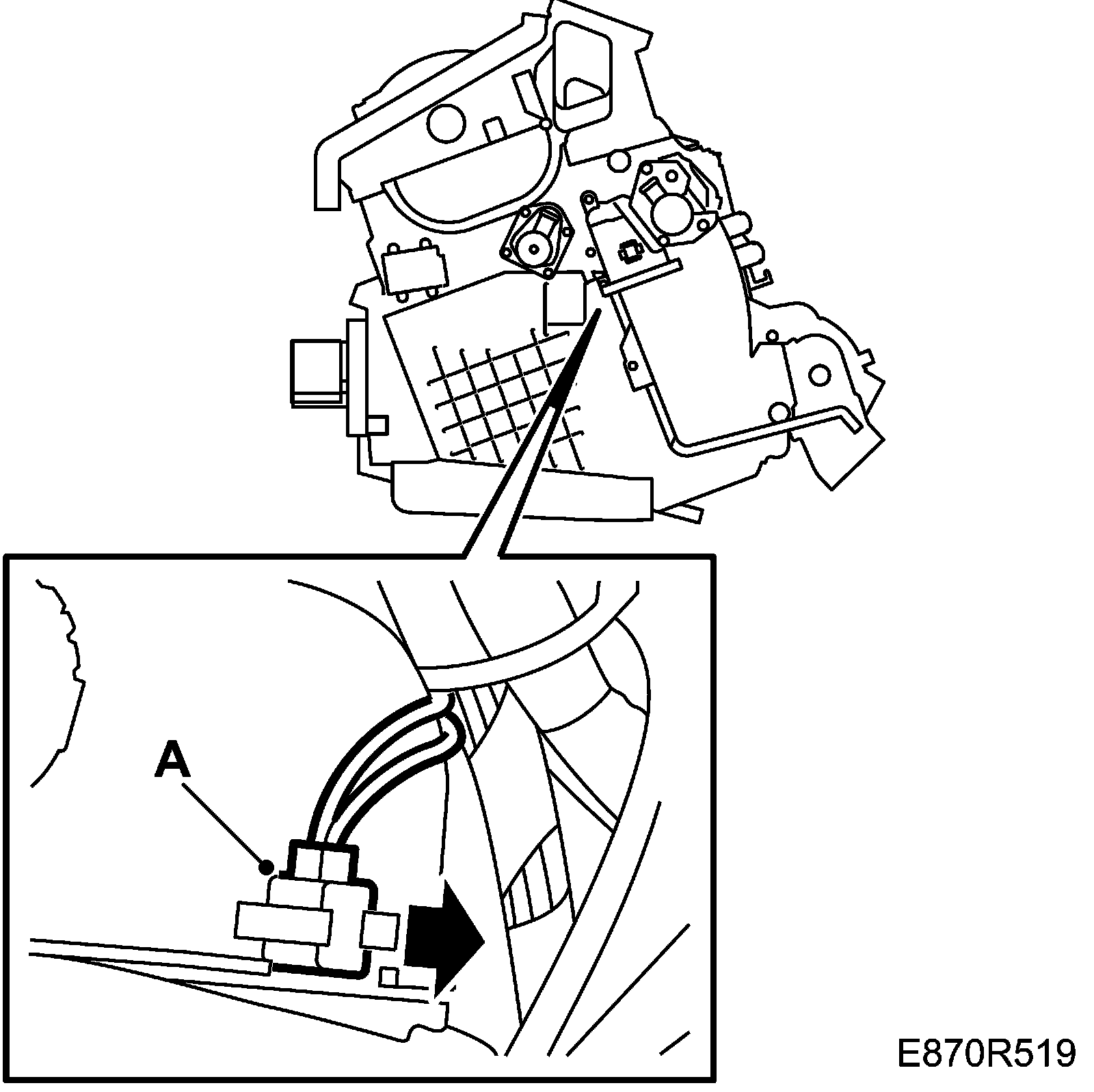 2. Refit the connector in the upper bracket for the heating and ventilation unit (A).