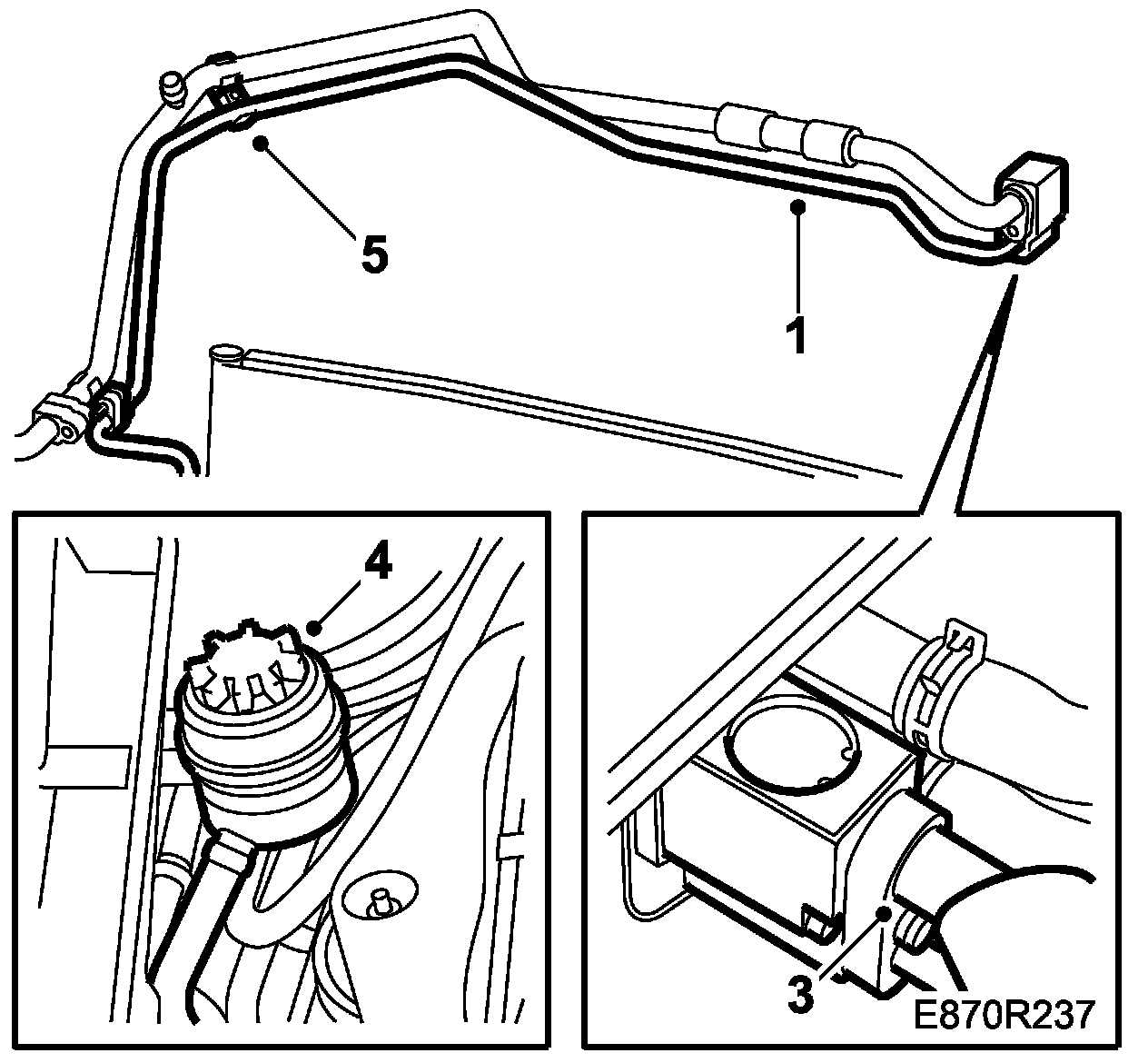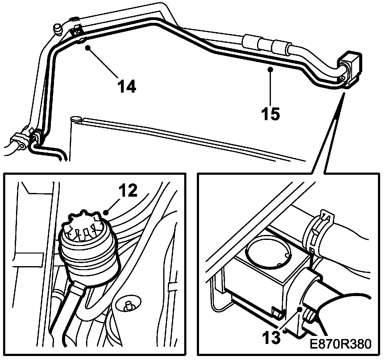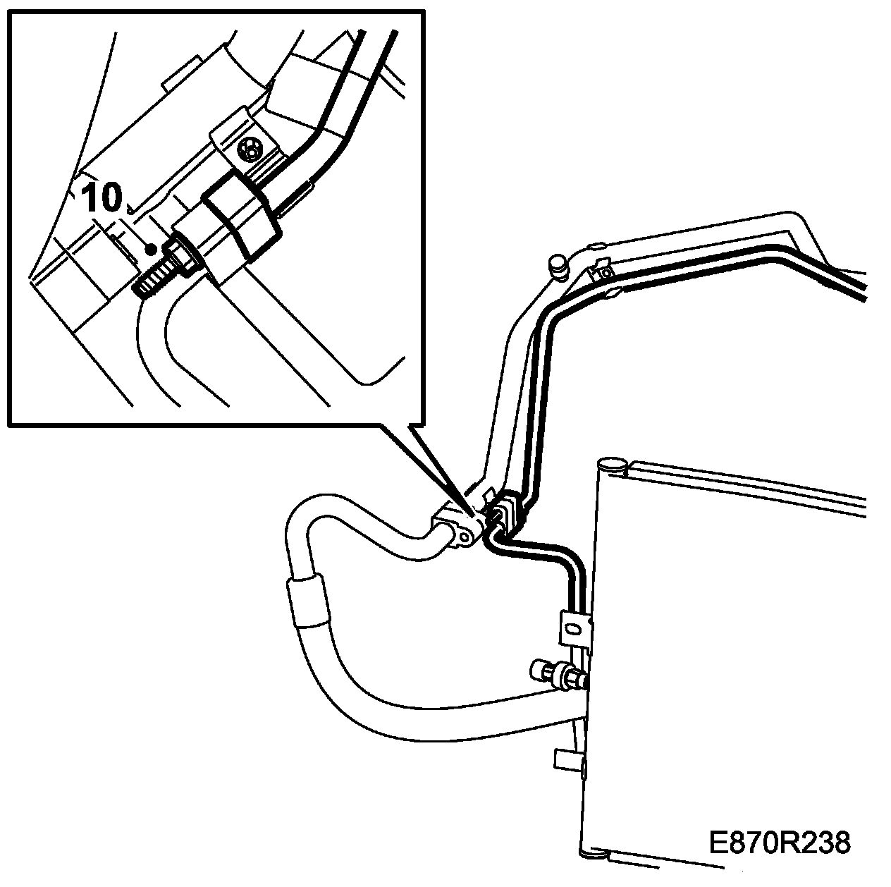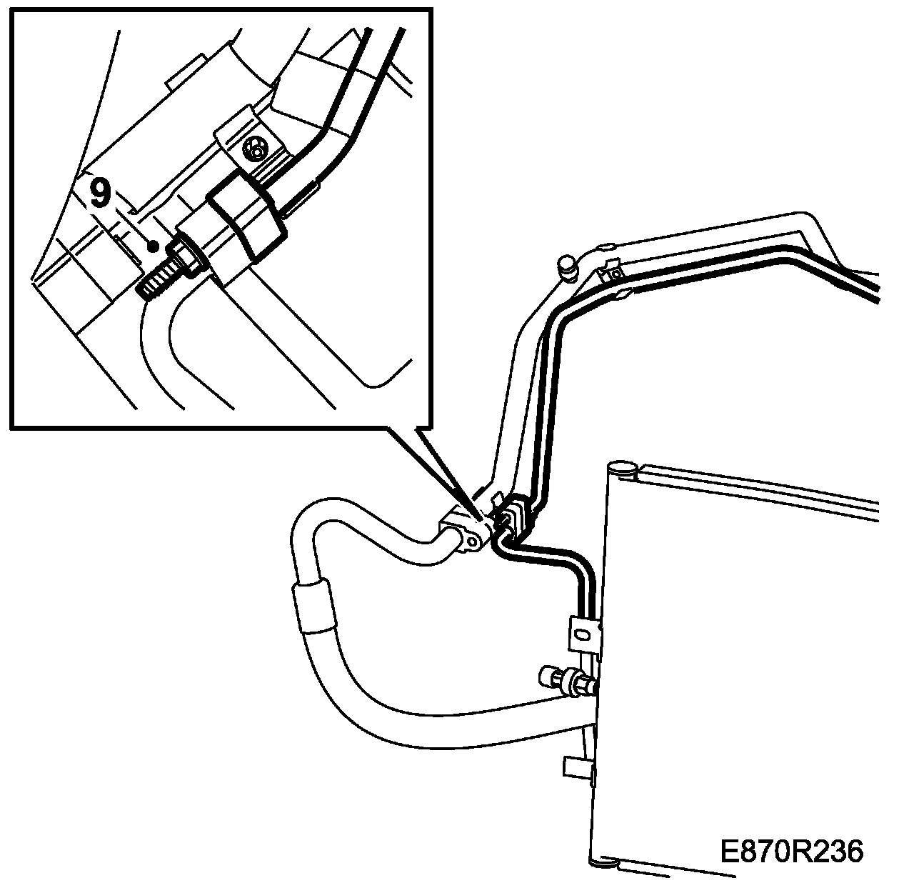 The evaporator's high-pressure pipe consists of two pipes running from the receiver via a joint by the console behind the right-hand headlamp to the expansion valve.