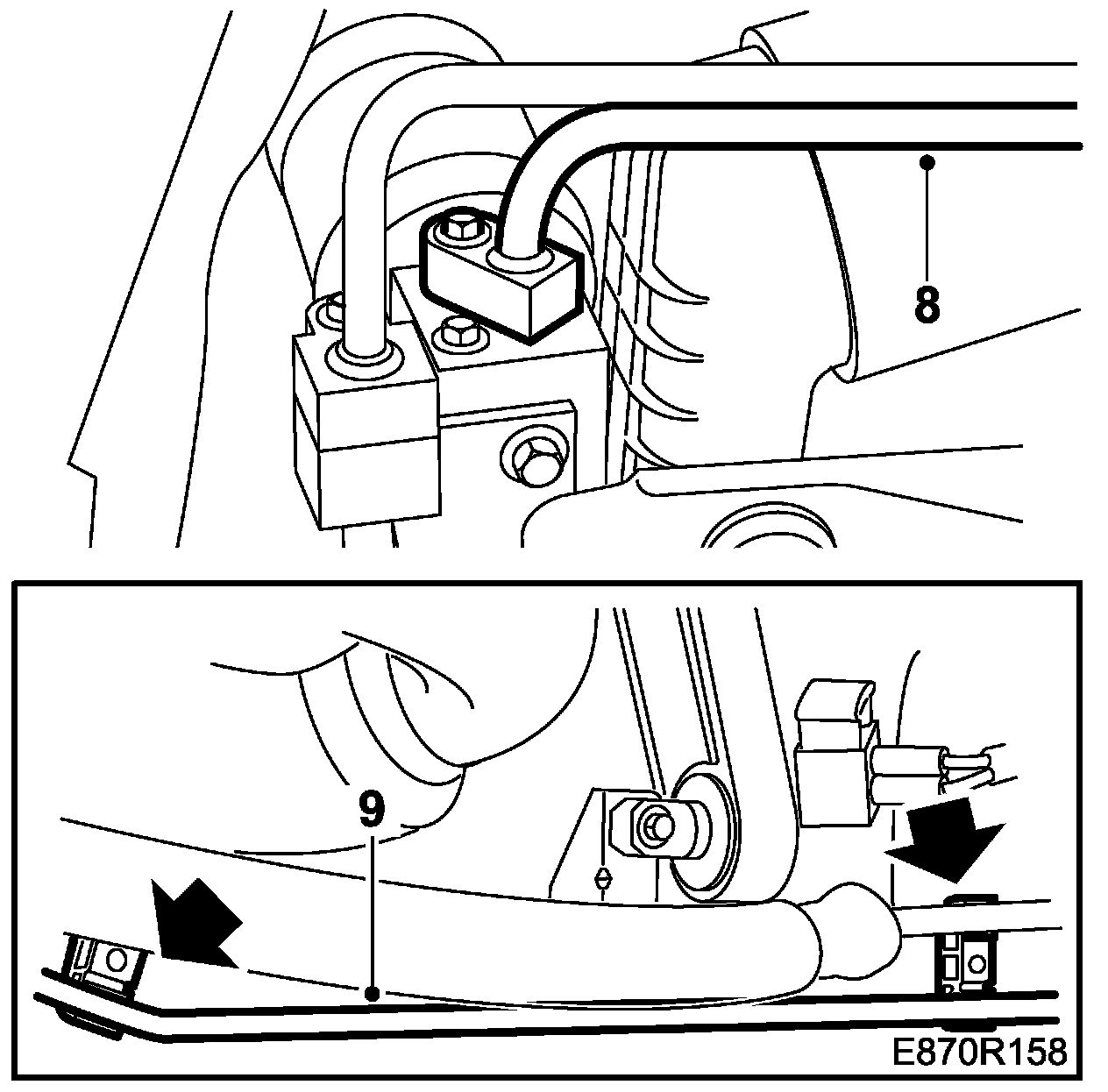 9. Detach the front end of the high-pressure pipe from the joint by the console behind the right-hand headlamp and plug the openings.