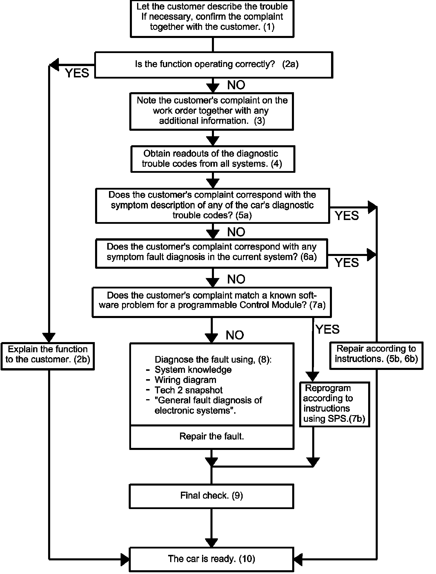 Saab's fault diagnosis strategy assumes that the technician is familiar with the customer's description of the problem. So note the customer's complaint and any other observations on the job sheet.