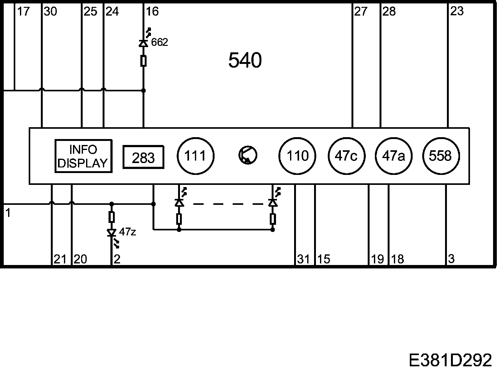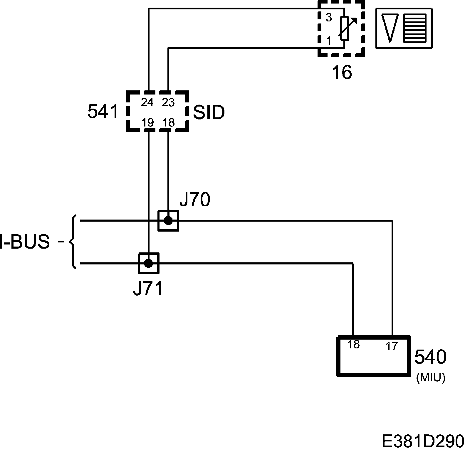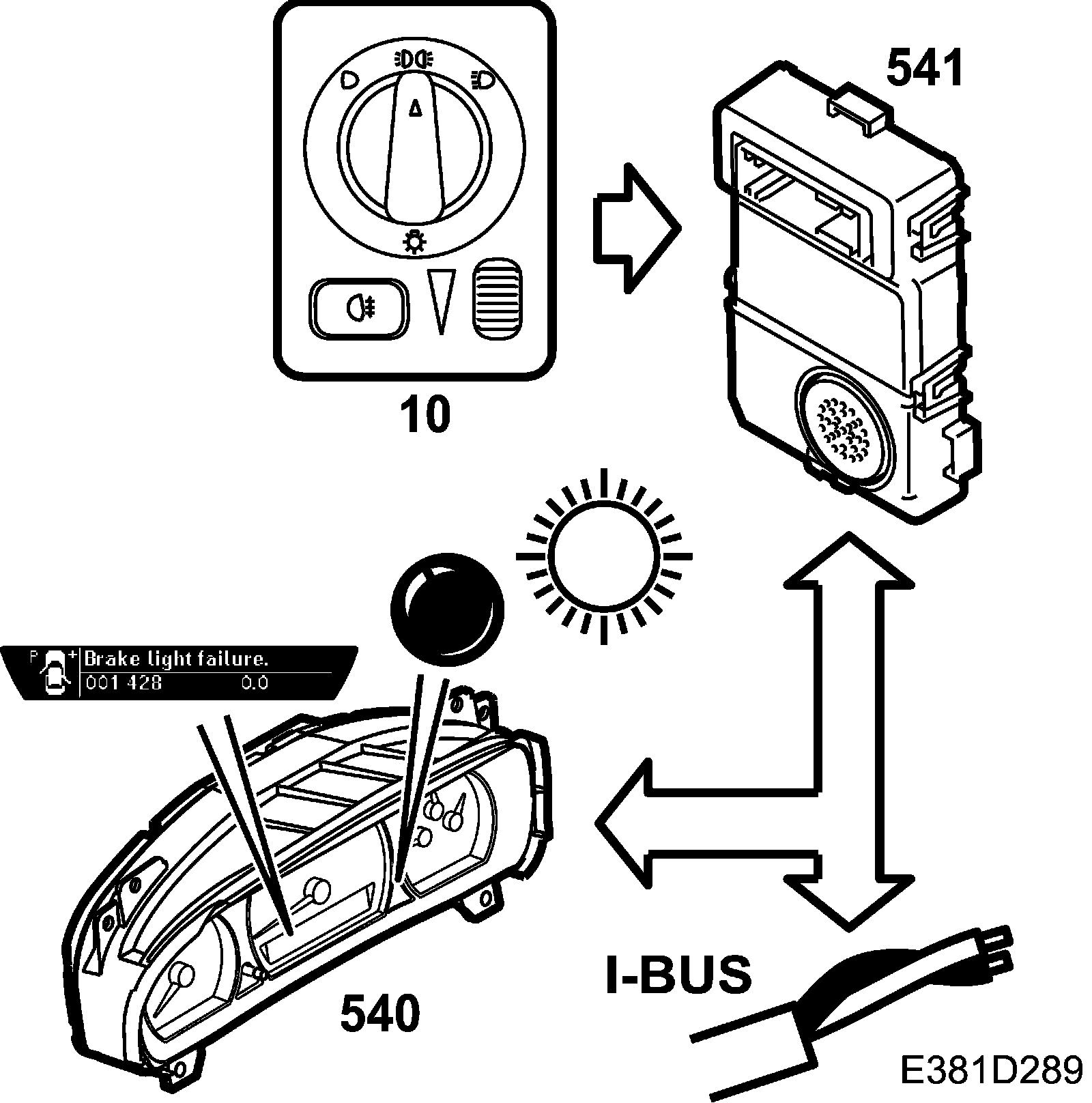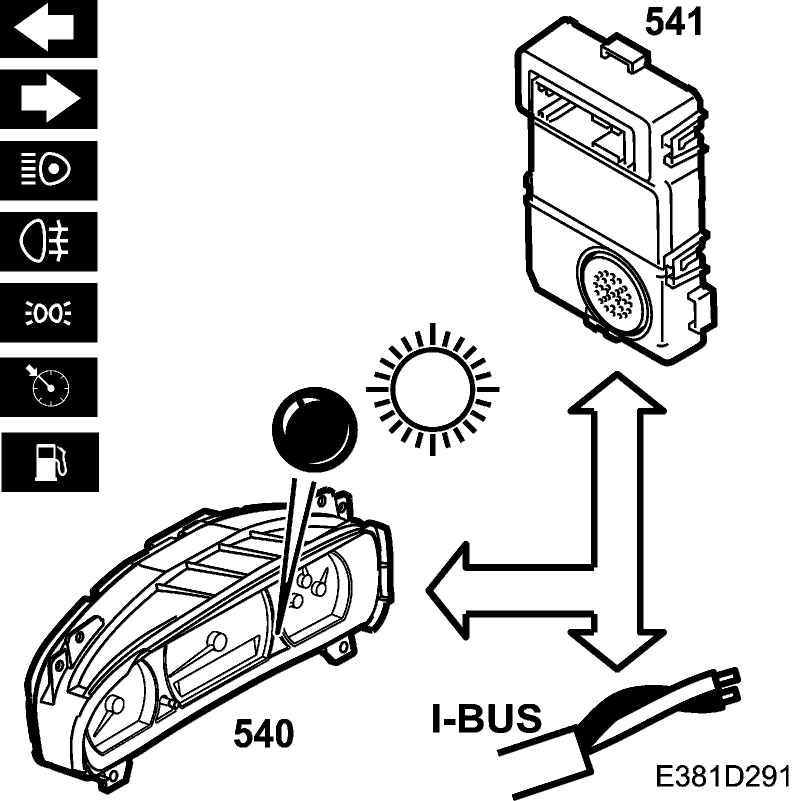 The rheostat is connected to the SID control module and the cabin light sensor is mounted in the main instrument unit. The main instrument unit reads the light sensor value and transmits this on the I-bus. The SID control module processes this value together with the rheostat value and continuously sends information about the following lighting values on the bus: