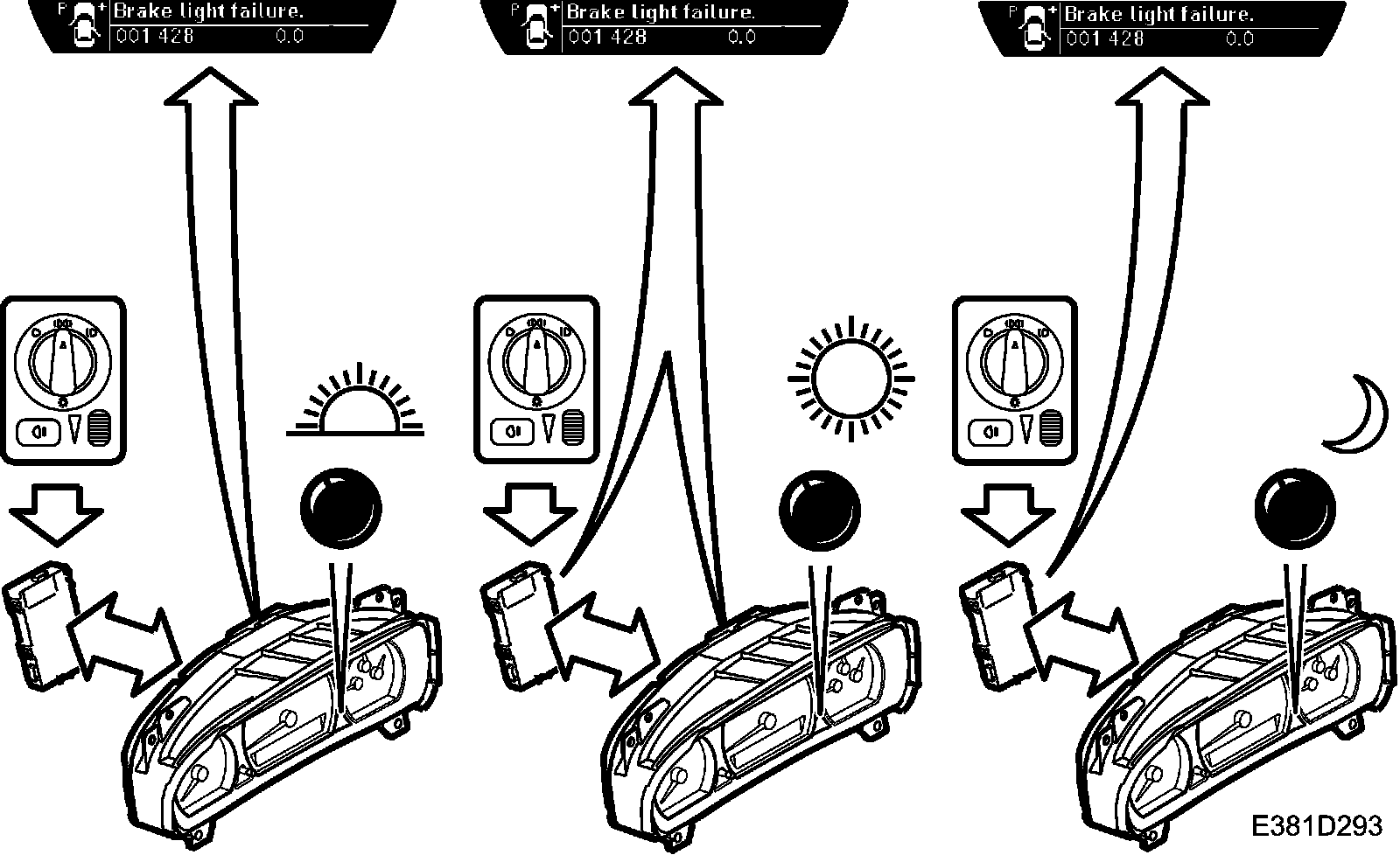 So that the main instrument unit gauges, lamps and information display will be easy to read in both daylight and at night, as well as to achieve optimum bulb life, the main instrument unit's control module regulates the lighting intensity of the display according to the brightness in the cabin and the rheostat setting selected by the driver.