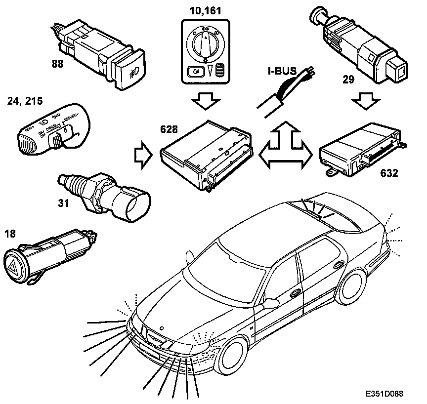 The reversing lights are turned on by the reversing-light switch when reverse gear is engaged. DICE outputs the status of the reversing-light switch (ON/OFF) to the bus.