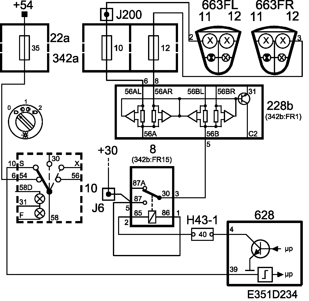 +54 voltage is fed via fuse 35 to pin 6 on the light switch. The voltage passes to pin 39 on DICE from pin 10 on the switch, whereby the dipped beam relay will be grounded via pin 4 on DICE and close. +30 voltage is fed through the dipped beam relay (8) via the filament monitor (228b) and fuses (11 and 13) and on to the headlamps (pin 3).