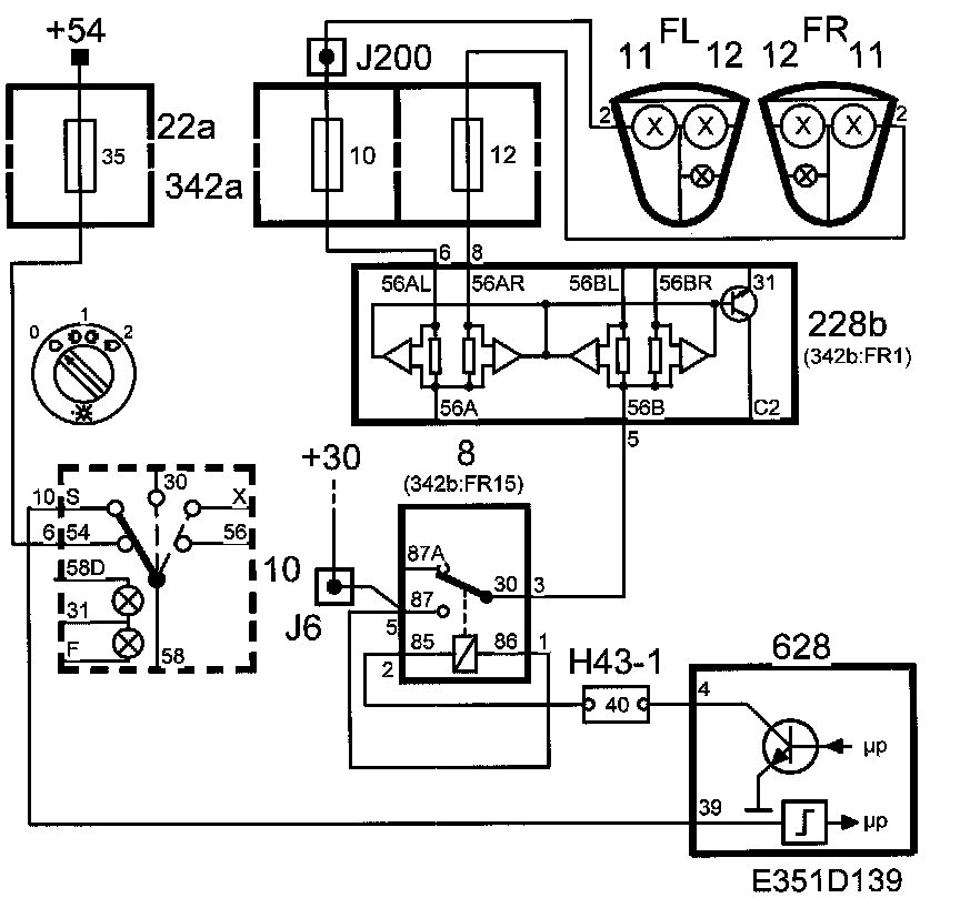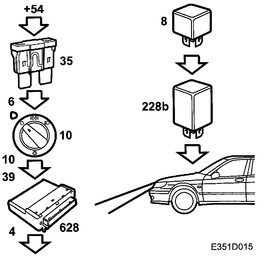 +54 voltage is fed via fuse 35 to pin 6 on the light switch. The voltage passes to pin 39 on DICE from pin 10 on the switch, whereby the dipped beam relay will be grounded via pin 4 on DICE and close. +30 voltage is fed through the dipped beam relay (8) via the filament monitor (228b) and fuses (11 and 13) and on to the headlamps (pin 3).