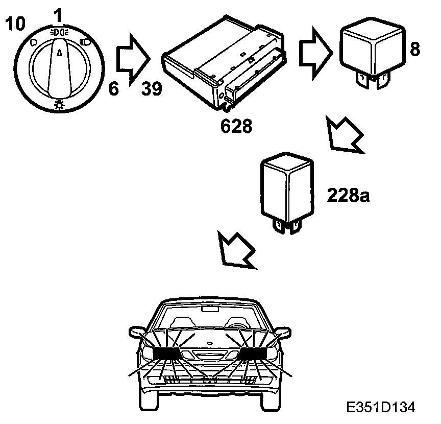 Dipped beam is on when the light switch (10) is in position 2 and the ignition is in OFF, ON or START position. When the ignition is ON, the power supply will be applied to the dipped beam lamps by DICE. Dipped beam is used on certain markets as daylight driving lights (light switch in 0 or 1). On some markets there are also side marker lights (234FL/FR). This is an extra filament in the front direction indicators that sends a beam of light to the side through an aperture in the reflector.