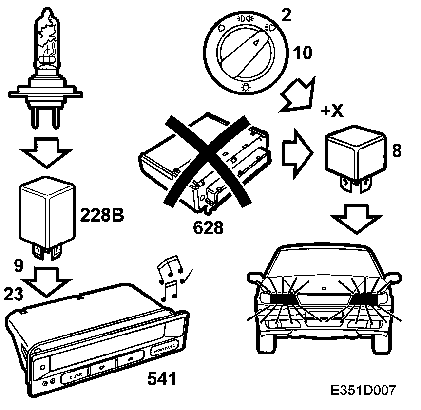 From pin 11 on the dipswitch (10), a voltage of +X is fed from the ignition switch to pin 15 on the control module, thus grounding the main light relay through pin 4 on the control module and causing the relay to close. A voltage of +30 is fed through the relay by way of the filament monitor and on to the fuses (11 and 13).