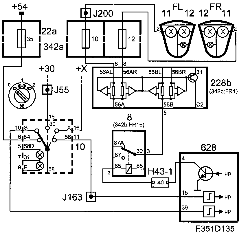 When the light switch is in position 2, voltage +X can also be utilized to supply the dipped-beam lamps with power. Voltage +X is fed to the dipped-beam relay, which will then be in the closed position, and the power is passed straight through the relay via the filament monitor (228b) and fuses (11 and 13) to the dipped-beam lamps. The dipped beam is somewhat dimmer, however, because the voltage drop in the system is larger than normal.