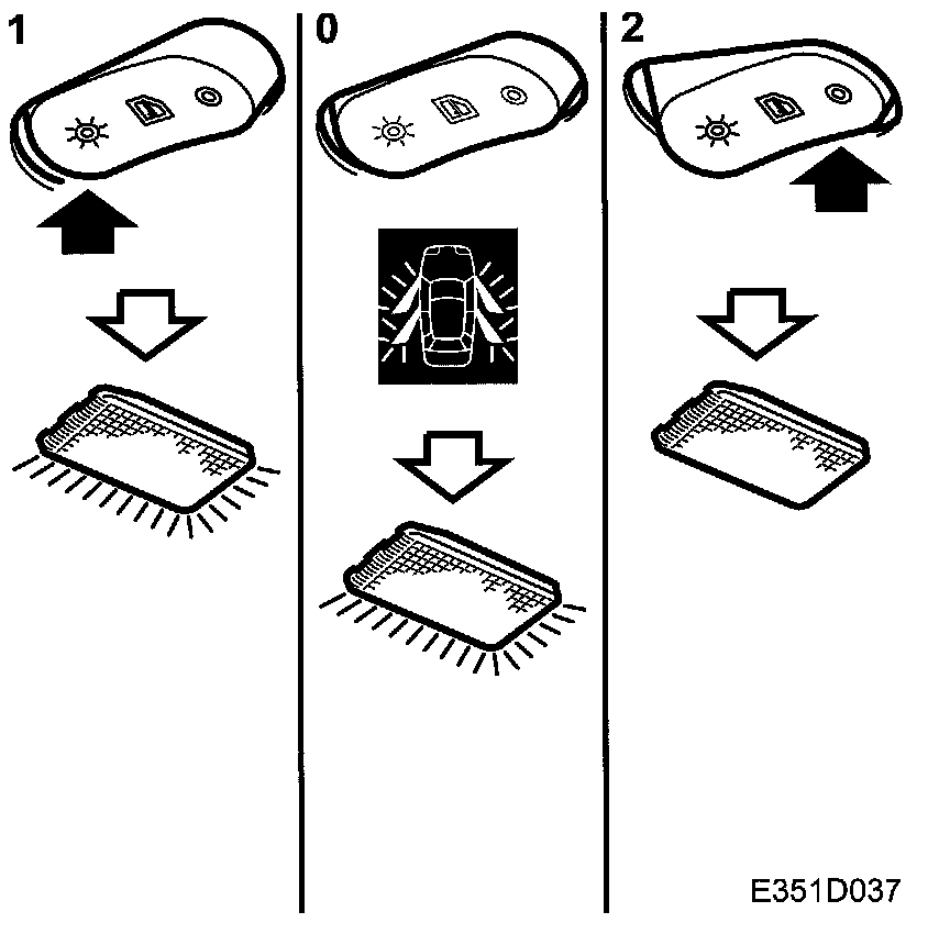 The floor well lighting under the dashboard is on when the light switch is in position 1 or when one or more doors are kept open. After 20 minutes, the floor lighting will be turned off automatically if the ignition switch is in OFF position.