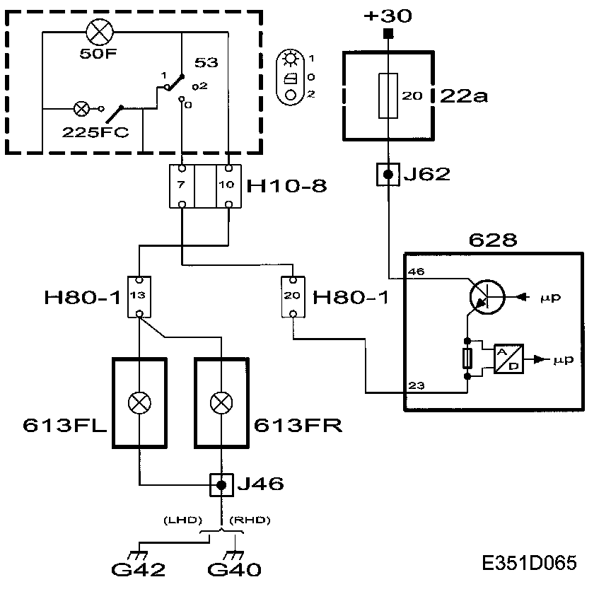 With the light switch in position 1, +30 voltage will be applied to DICE pin 24 via fuse 8. +30 is fed from DICE pin 70 to the floor lights (613FL and 613FR).
