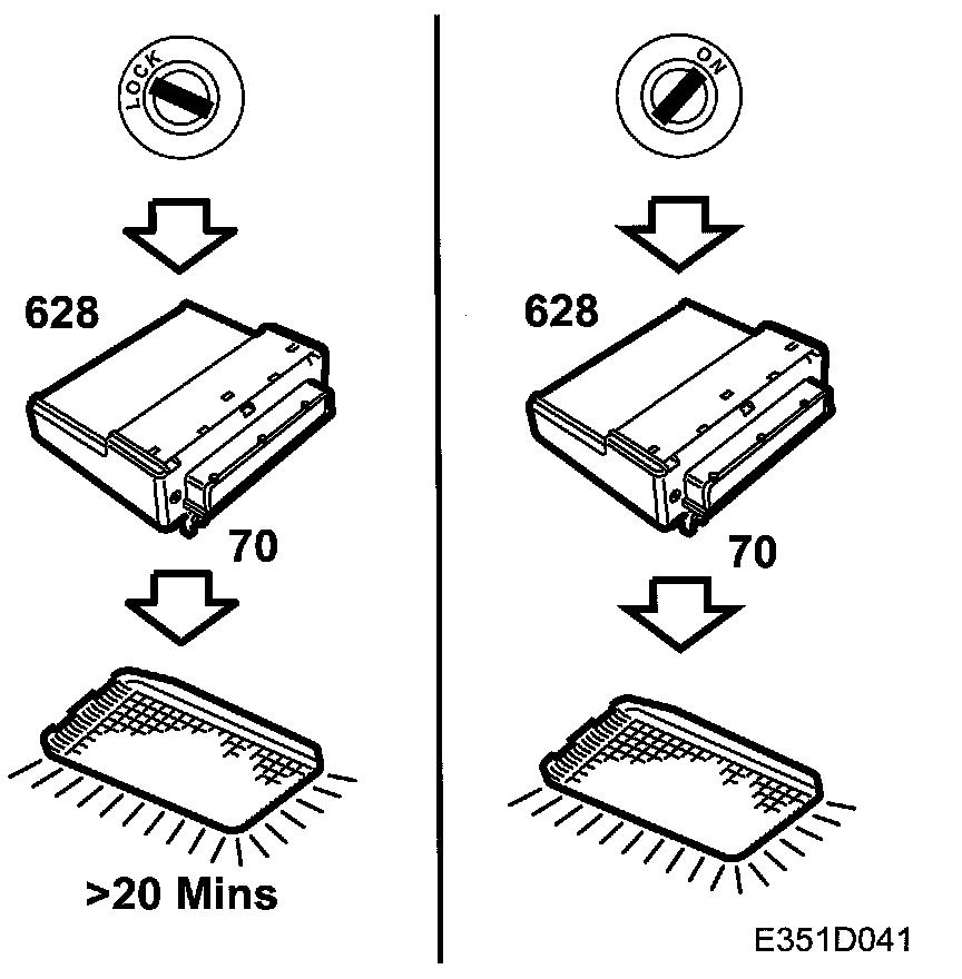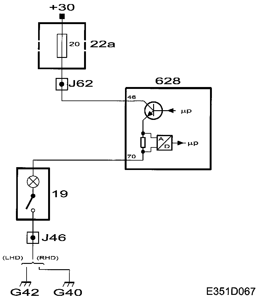 Voltage +30 for the glove-box lighting is always fed to DICE via fuse 20. Power is fed from pin 70 on the control module to the lamp (19).