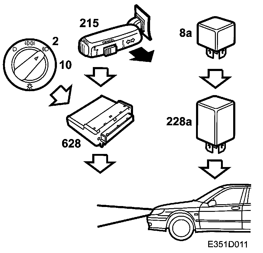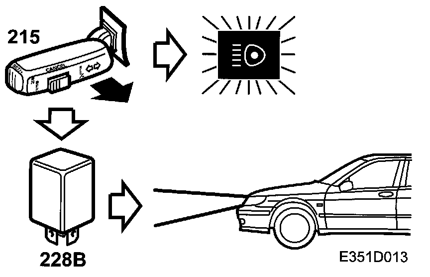 When the dipswitch (215) is moved to its "spring-loaded" position, the main-beam lamps will be powered with +30 which goes via the filament monitor (228b) and the fuses (10 and 12) to the main-beam lamps (11 FL and 11FR)