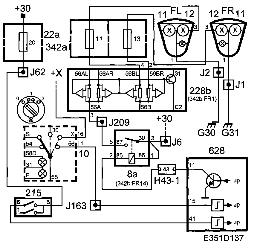 B+ is supplied to control module pin 15 from connection 11 on the light switch (10). When light switch (215) pin 6 is supplied with voltage, DICE is supplied with +30 on pin 41. DICE lights the main beam by pin 11 on the control module grounding pin 5 on the main beam relay (8a). When the relay is closed, +30 is fed through the relay via the filament monitor (228b) on to fuse 12 (right main beam lamp) and fuse 10 (left main beam lamp).