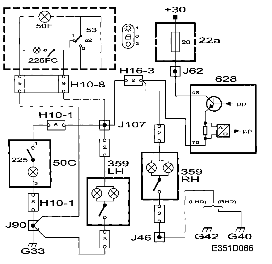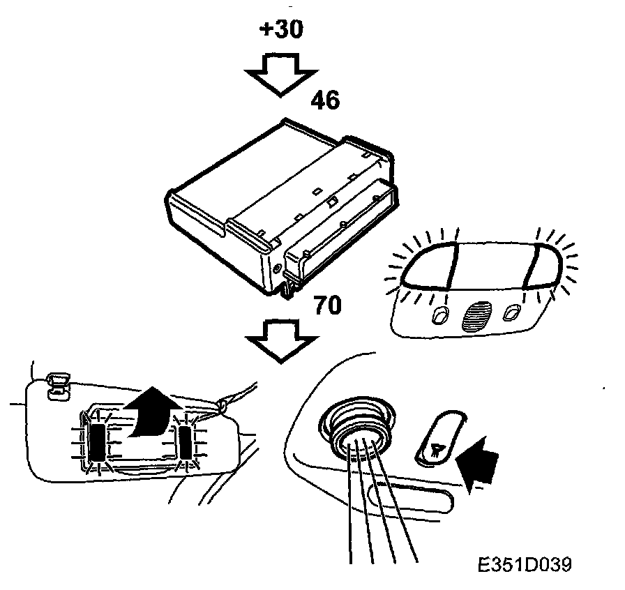Voltage +30 for the reading and mirror lighting is always fed to DICE. From pin 70 on the control module the power goes out to the lamps (50F, 50C, 359RH and 359LH). The lights are turned on using their own individual switches.