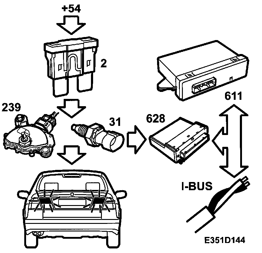 The same voltage supplied to the reversing lights (32 HL and 32 HR) is also applied to pin 45 on DICE. This information is used for the rear window wiper. The control module detects the voltage and sends reverse gear information on the bus that is used by other systems, e.g. the PMM (Power Mirror Memory).