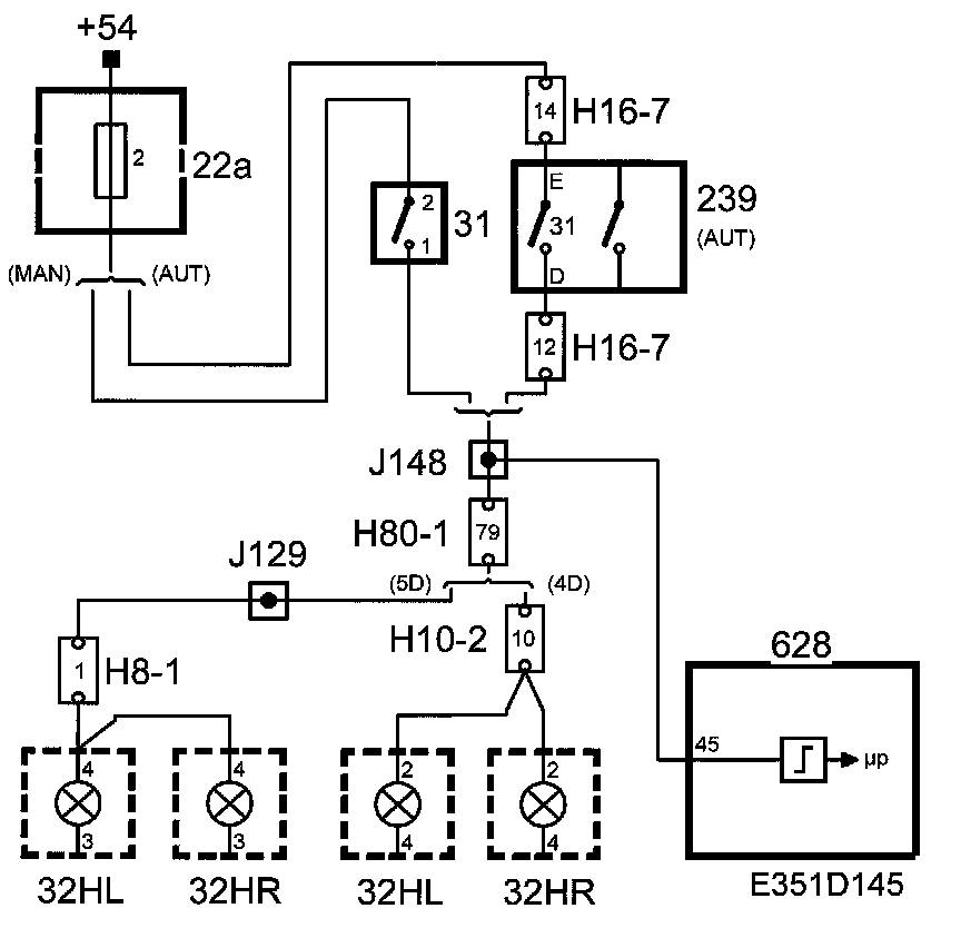 ^ When reverse gear is engaged on an automatic transmission, the reversing-light switch (31) in the gear selector (239) closes and current is fed to the reversing lights via the reversing-light relay (405).