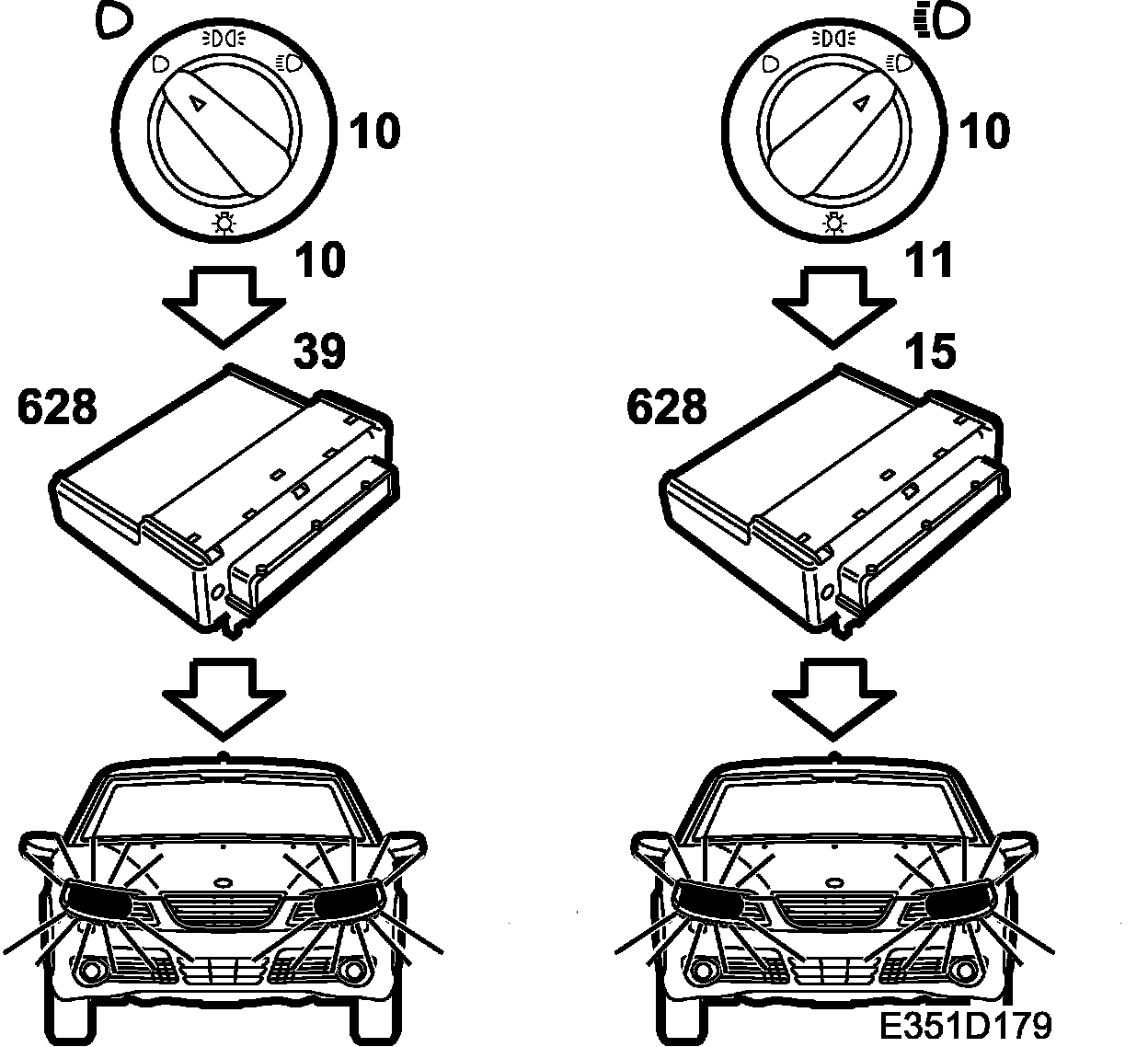 The light switch positions operate different lighting modes depending on how DICE is programmed. There are 3 different program alternatives. The reason for this is that different markets demand different lighting modes. When program alternative 1 is to be used, fuse 35 must first be removed.