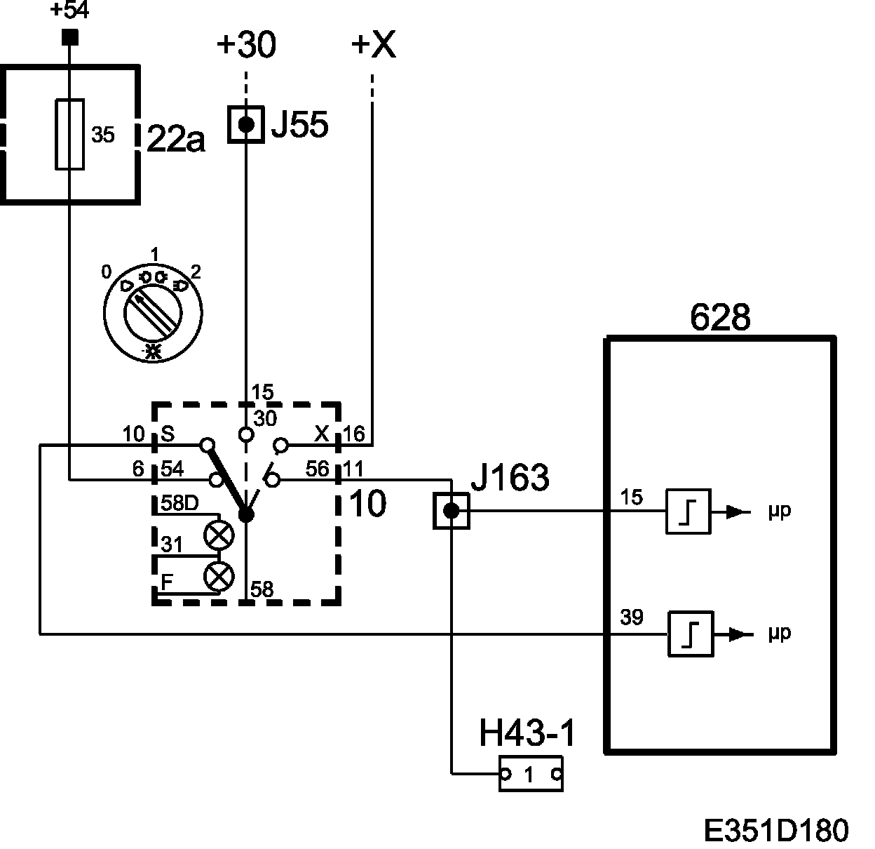 Main beam is controlled by dipswitch (215) and light switch (10). If the light switch (10) is in position 0 and the switch (215) is on, +30 is fed to the main beam bulbs (11) via the filament monitor (228b) and fuses 10 and 12. The light switch (10) must be in position 2 for the main beam bulbs to shine continuously. DICE (628) then grounds the relay (8a) which supplies power to the main beams via the filament monitor (228b) and fuses 10 and 12.