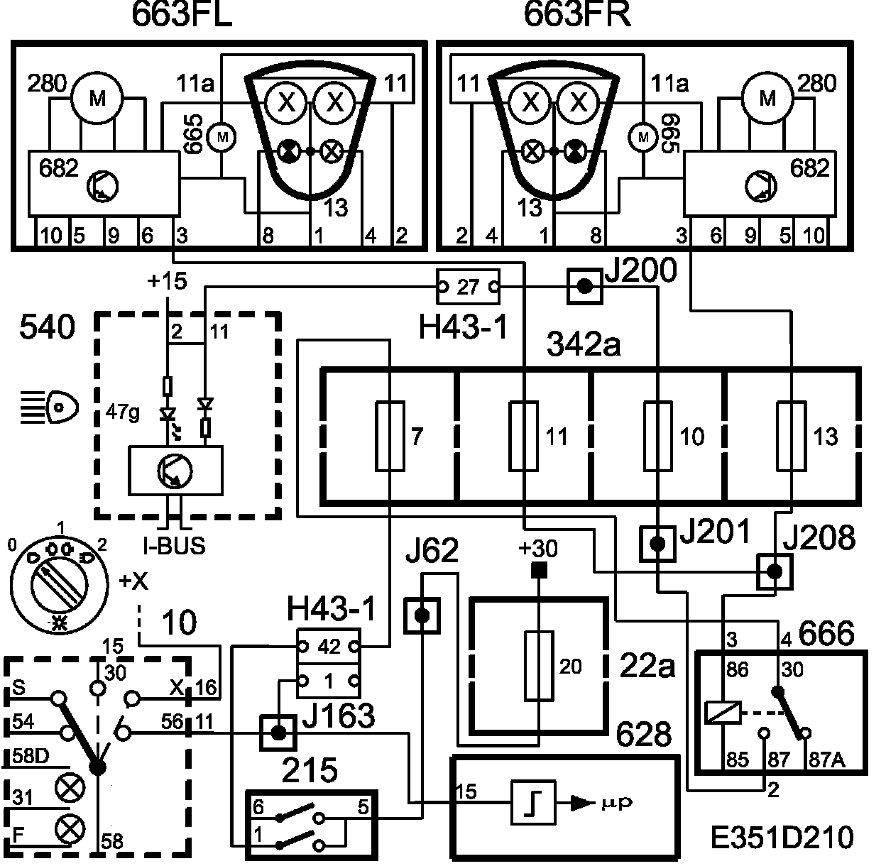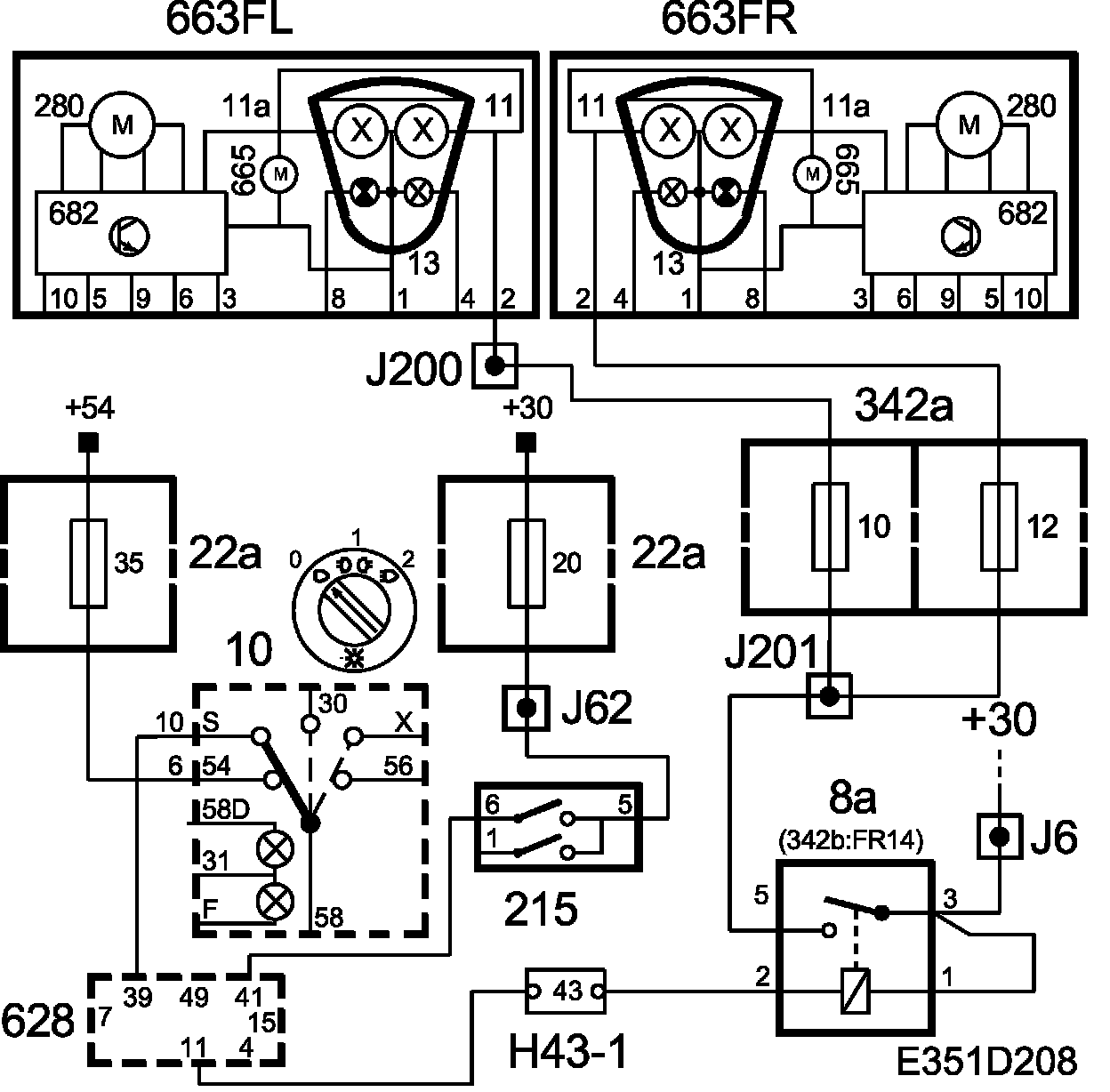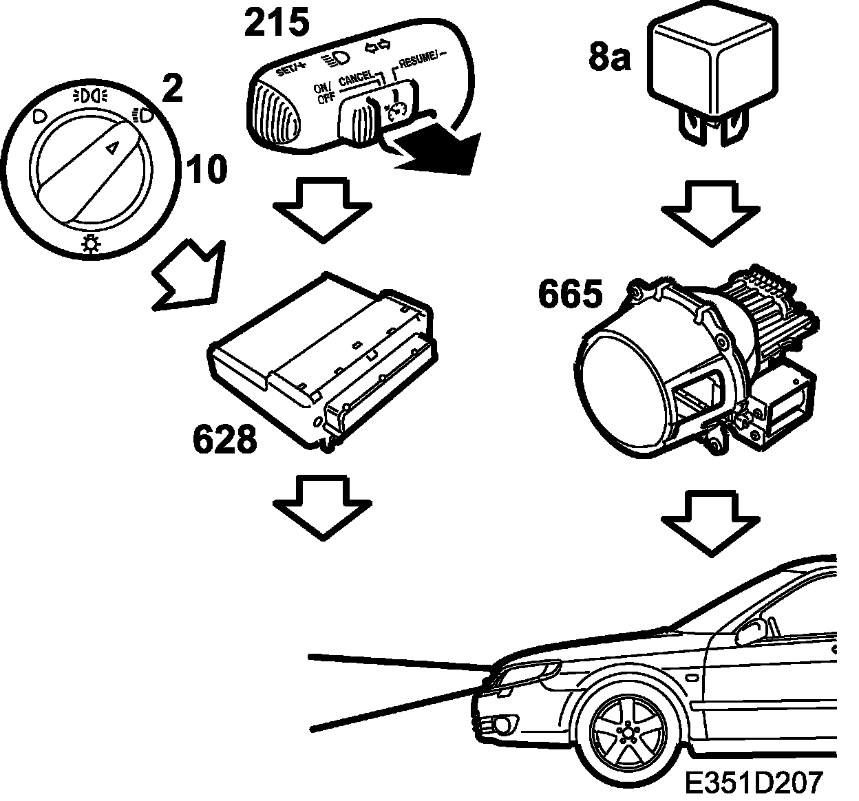 B+ is fed from connection 11 on the light switch (10) to pin 15 on the control module. When the switch (215) is turned on, B+ voltage will be fed from pin 6 to DICE pin 41. DICE turns on the main beam when pin 11 on the control module grounds pin 5 on the main beam relay (8a). With the relay closed, B+ voltage will be fed via fuse 12 to pin 2 on the right-hand headlamp and via fuse 10 to pin 2 on the left-hand headlamp, whereby the motors will drop the xenon lamp screens.